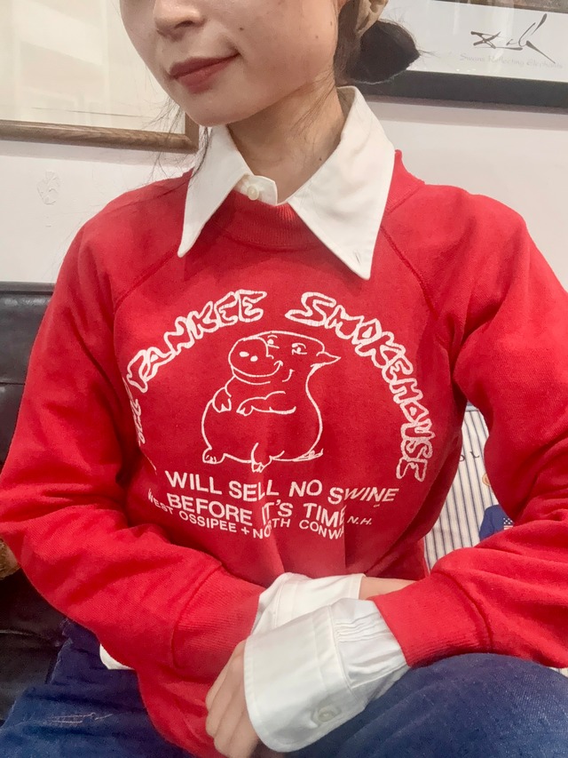 【ITEM】 80s Bassett Walker Raglan Print Sweat Made in USA 【SIZE 】 L (14-16) youth表記 肩幅 ラグラン 身幅 46cm 着丈 45.5cm 袖丈上 62.5cm 袖丈下 48cm 【COLOR】 レッド 【CONDITION】 裾のリブが弱まっております。 フロント・右袖に薄汚れがあります。 バック両袖に汚れと僅かなダメージがあります。 他目立つダメージは無く、着用に支障がある様なダメージはありません。 80s Made in USA Bassett Walker タグ アメリカのニューハンプシャー州にあるレストランのスウェット。 フロントには可愛らしい豚とメッセージがプリントされたユニークな1着です。 *商品の写真はできる限り実物の色に近づけるようにしておりますが、実際の商品と色味が若干異なる場合がございます。ご不明な点はお問合せ下さい。