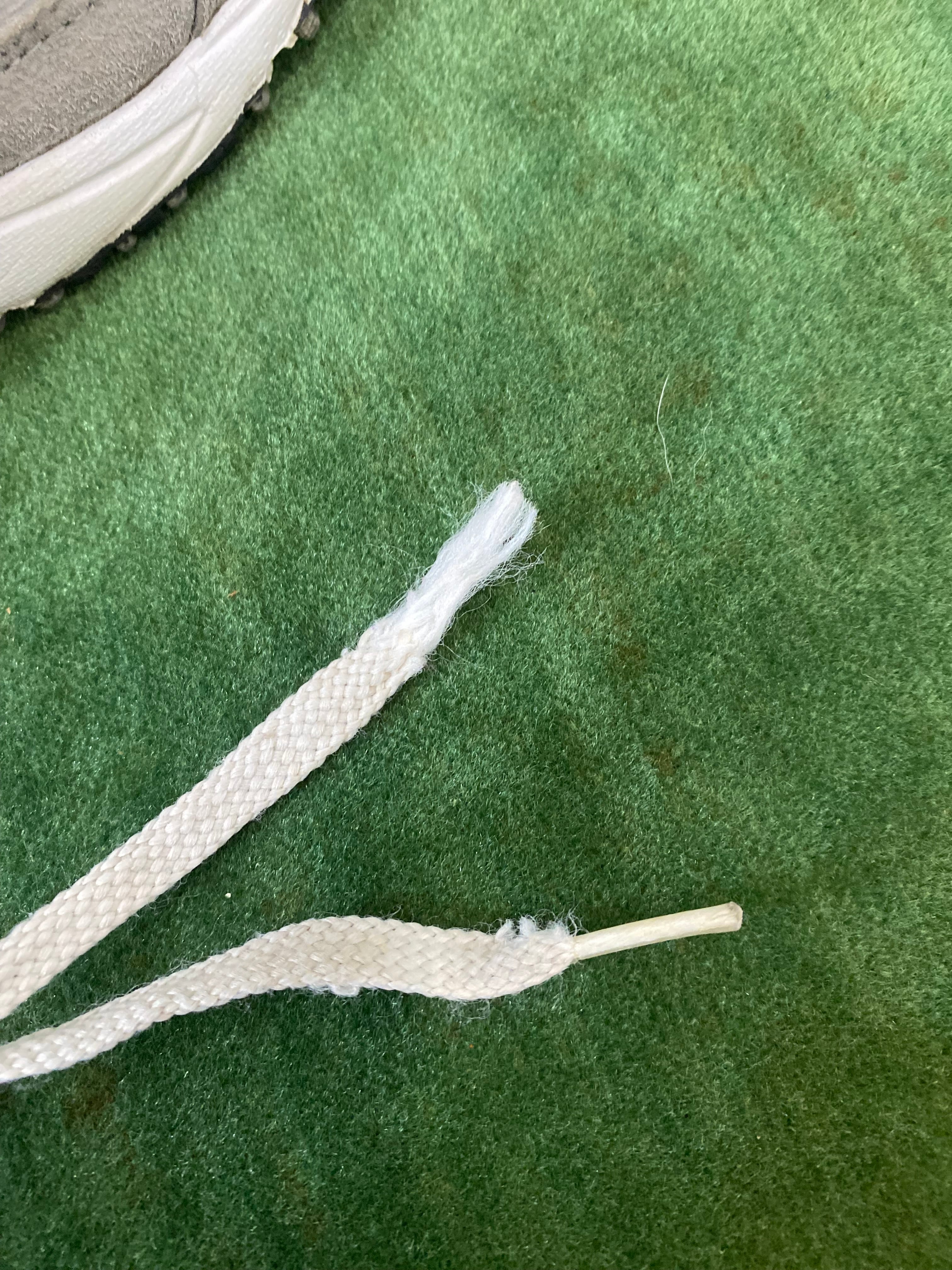 右足の靴紐の先が解けています。