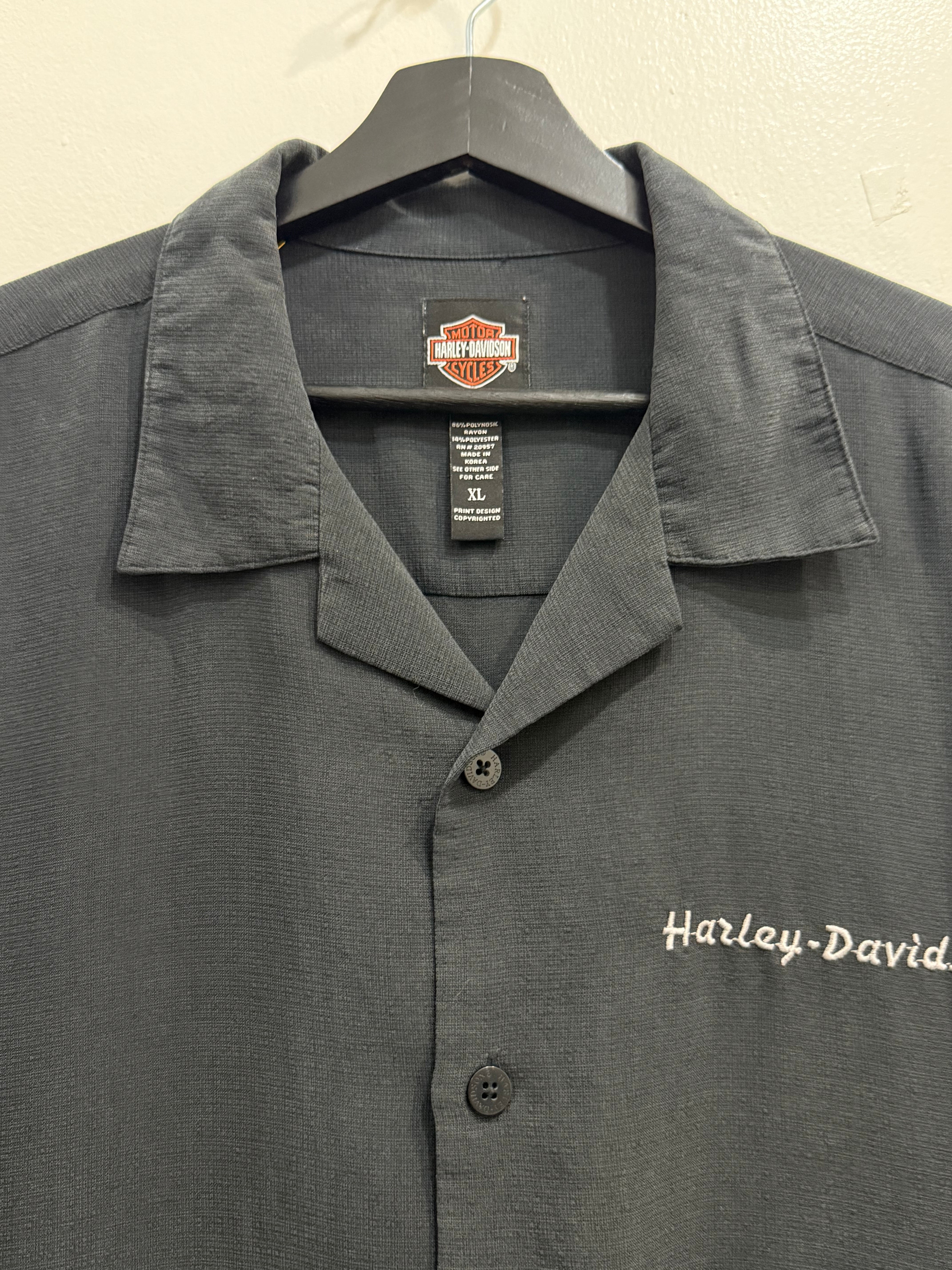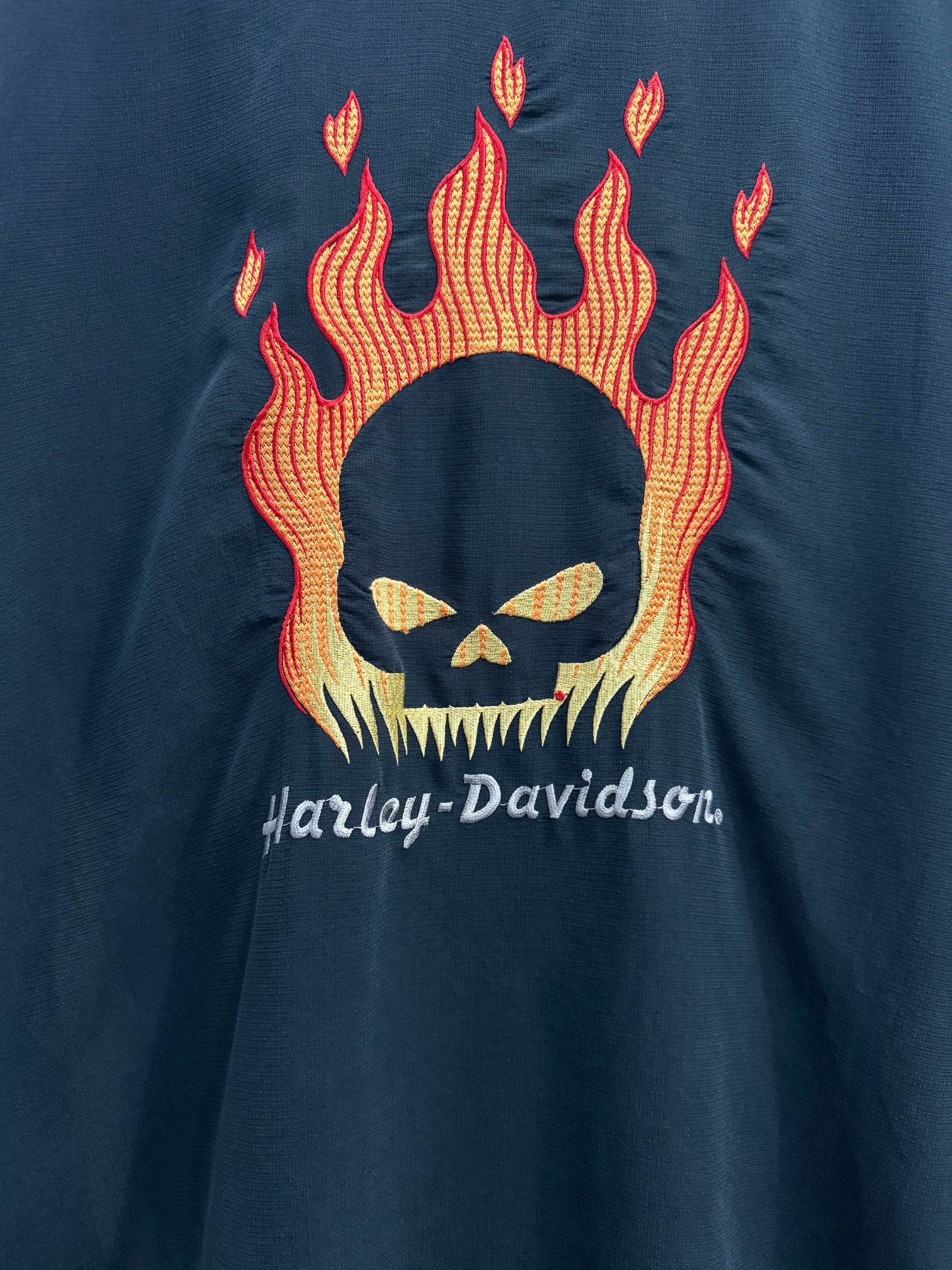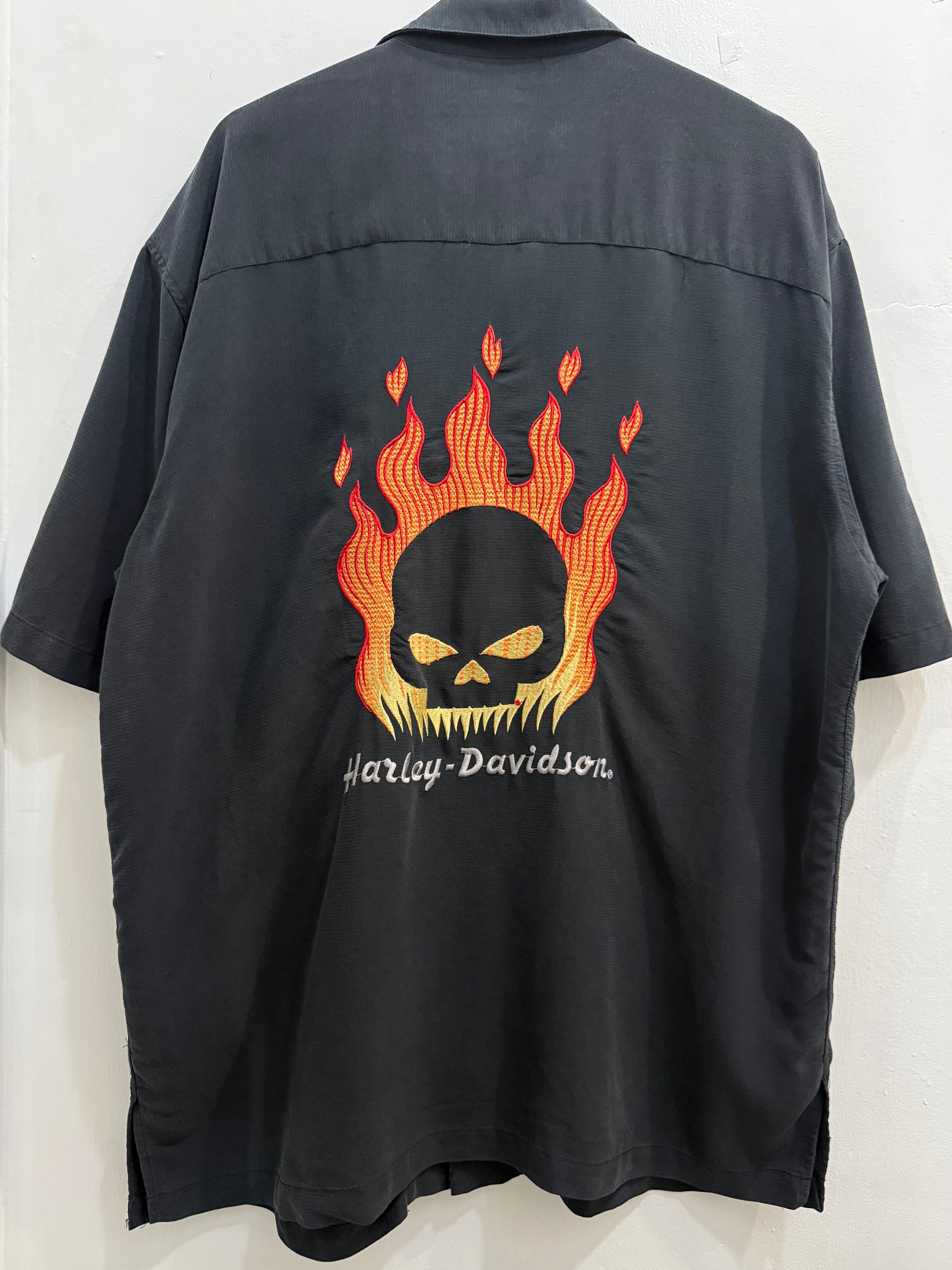Harley-Davidson Skull Flame Fire Pattern Short sleeve shirt / ハーレーダビッドソン オープンカラー ボックス 解禁 半袖 シャツ 刺繍 スカル フレイム | TOMOSHIBI USED&VINTAGE CLOTHING