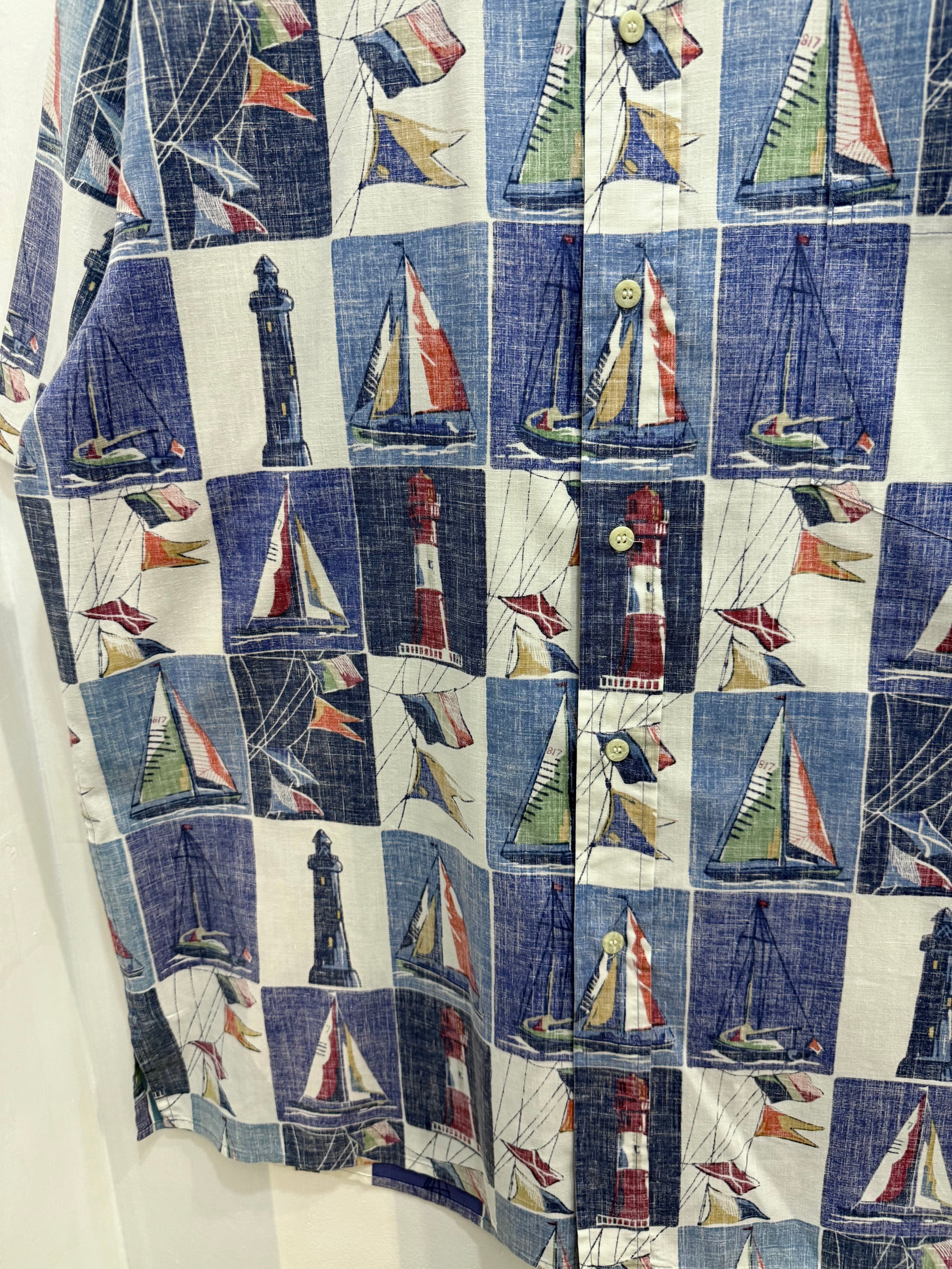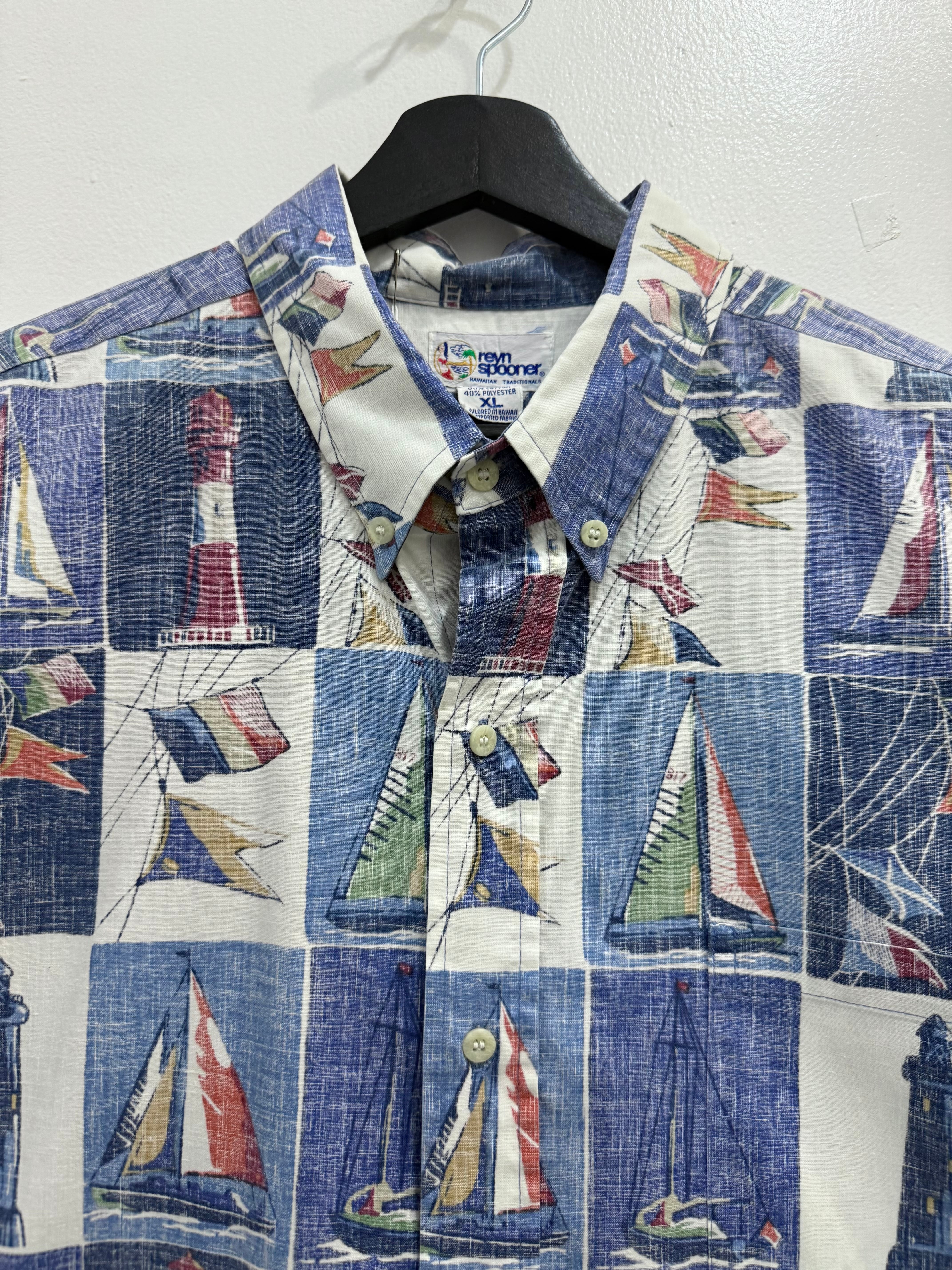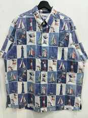 90s HAWAII REYN SPOONER Yacht Lighthouse All-Over Print Short-Sleeve Shirt / 90年代 HAWAII製 レインスプーナー ヨット 灯台 総柄 半袖 シャツ ハワイアン アロハシャツ | TOMOSHIBI USED&VINTAGE CLOTHING