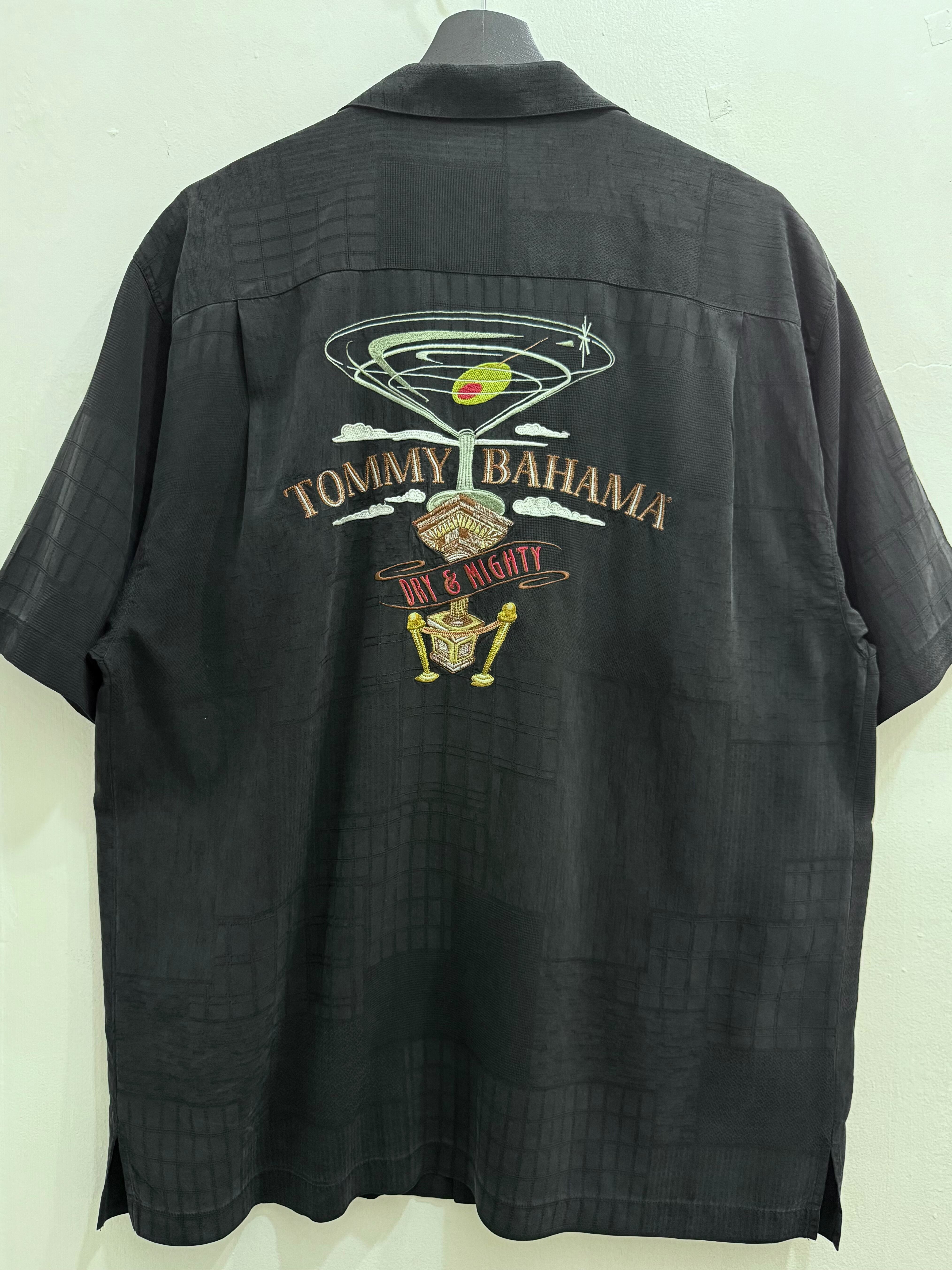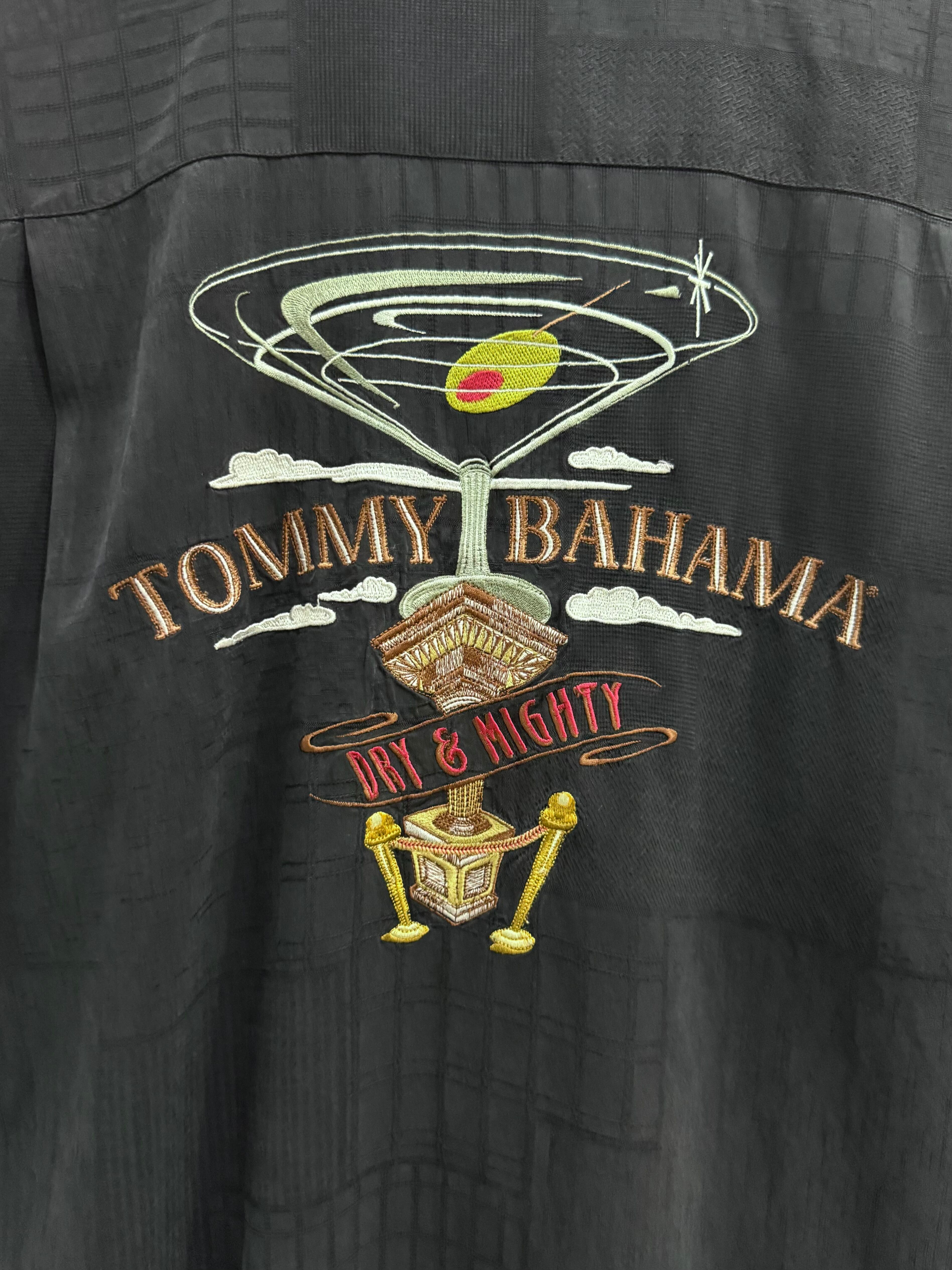 バックにはTOMMY BAHAMAとDRY&MIGHTYの文字とカクテルの刺繍デザインが入り、