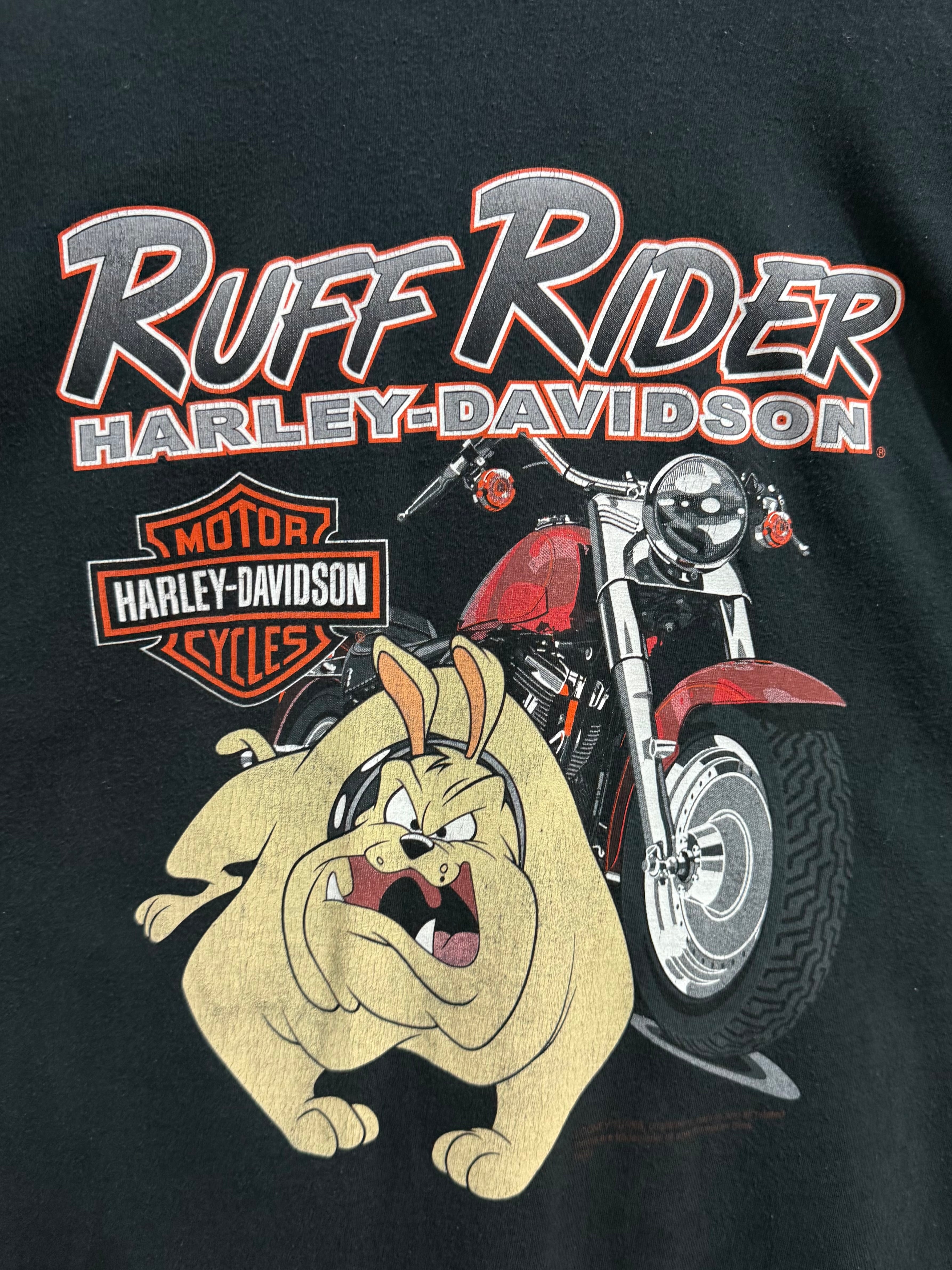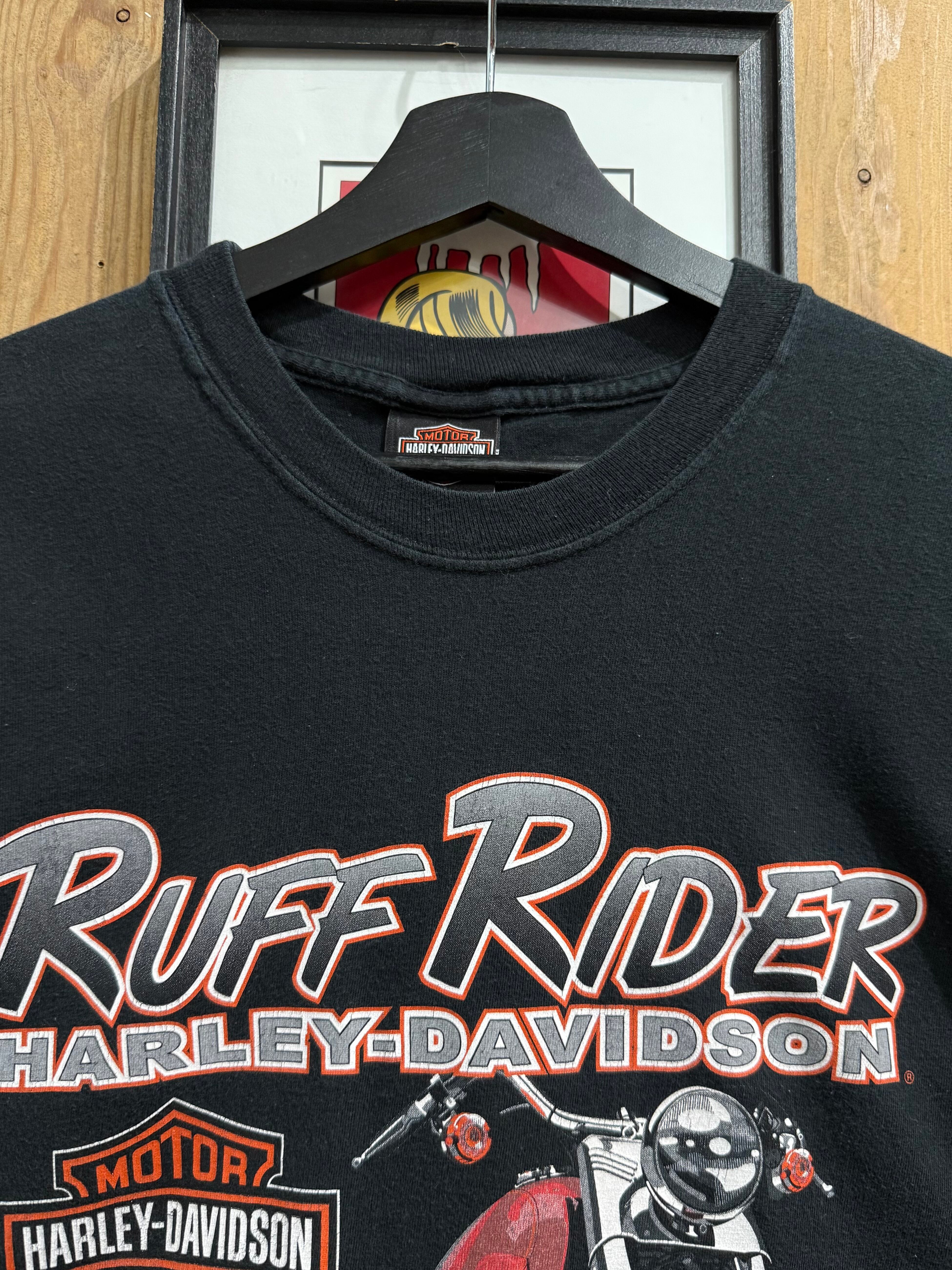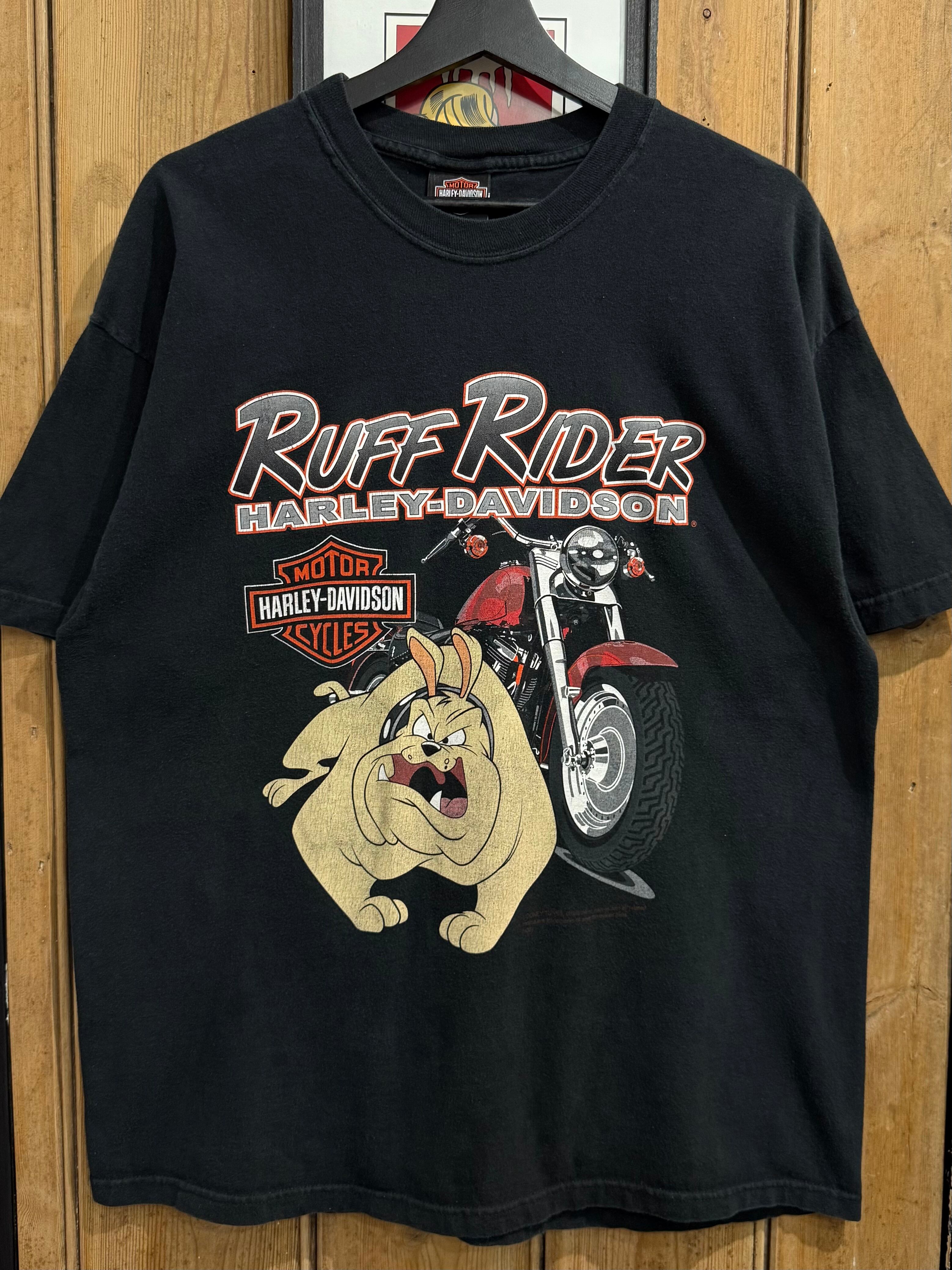 Ruff Riderロゴと共に、迫力あるグラフィックがバイカー魂を感じさせます。背面にはH-D of FT. MYERS, FLORIDA USAのショップロゴ入りで、コレクションや普段着にもおすすめの1着です。