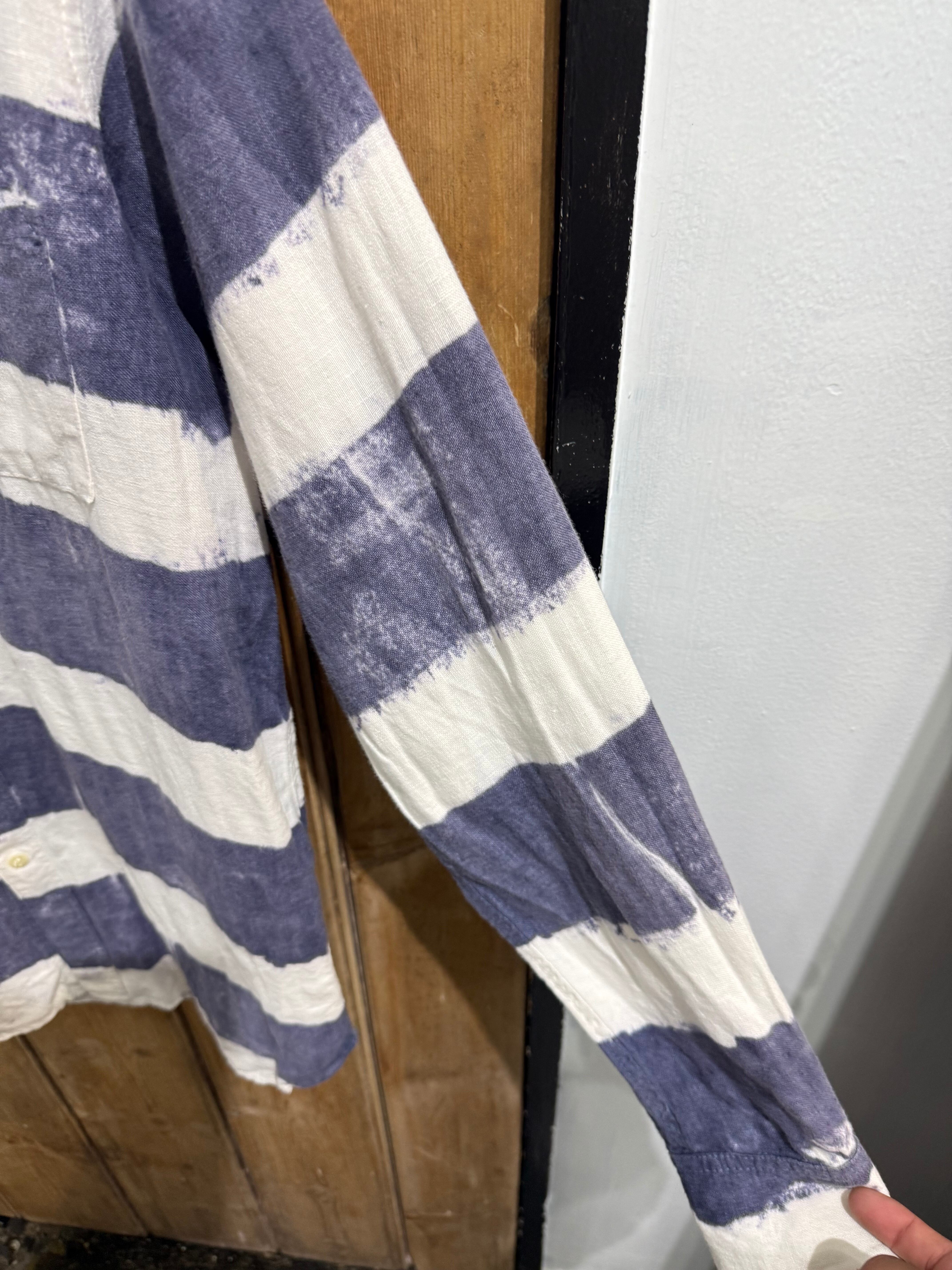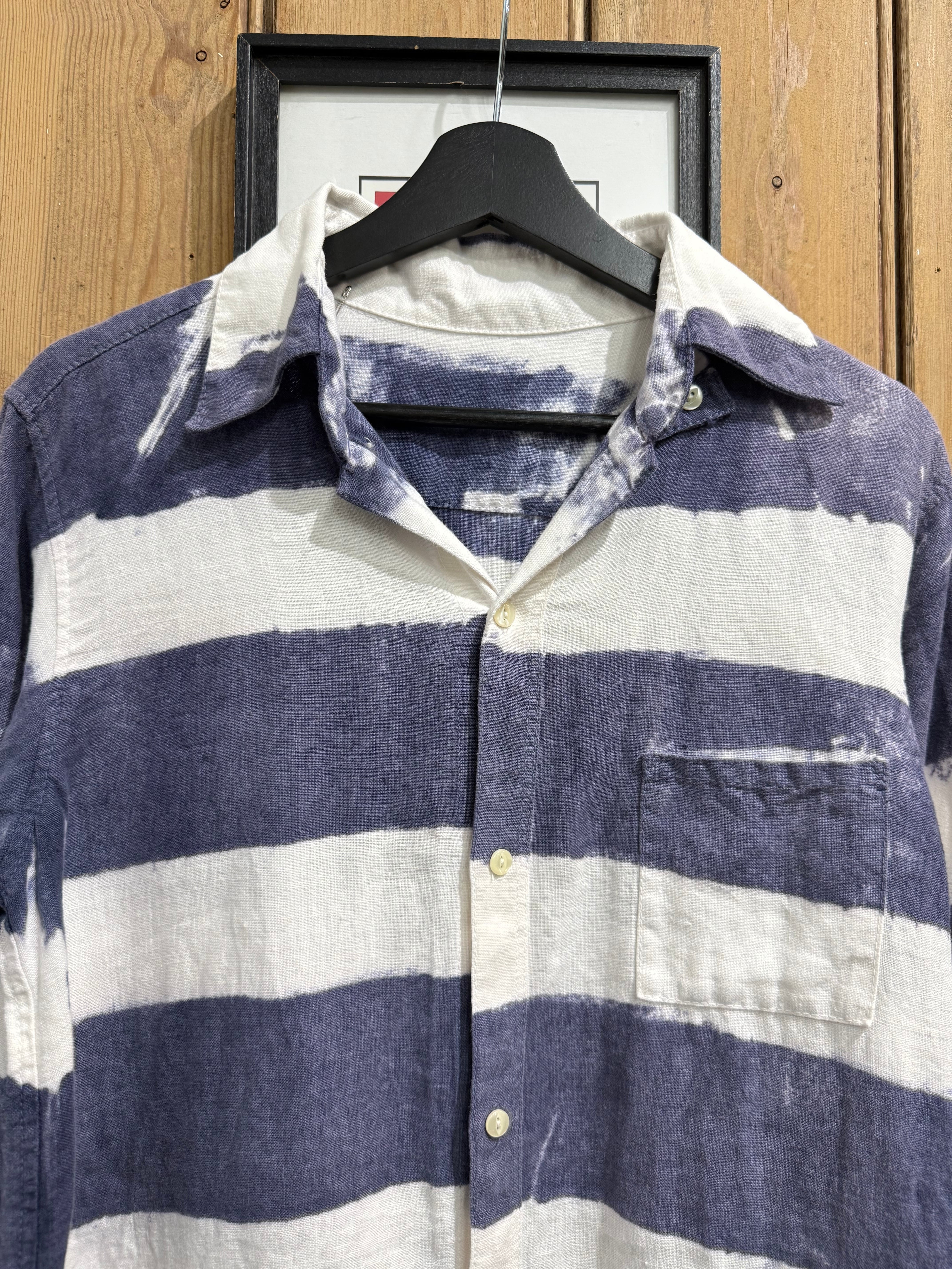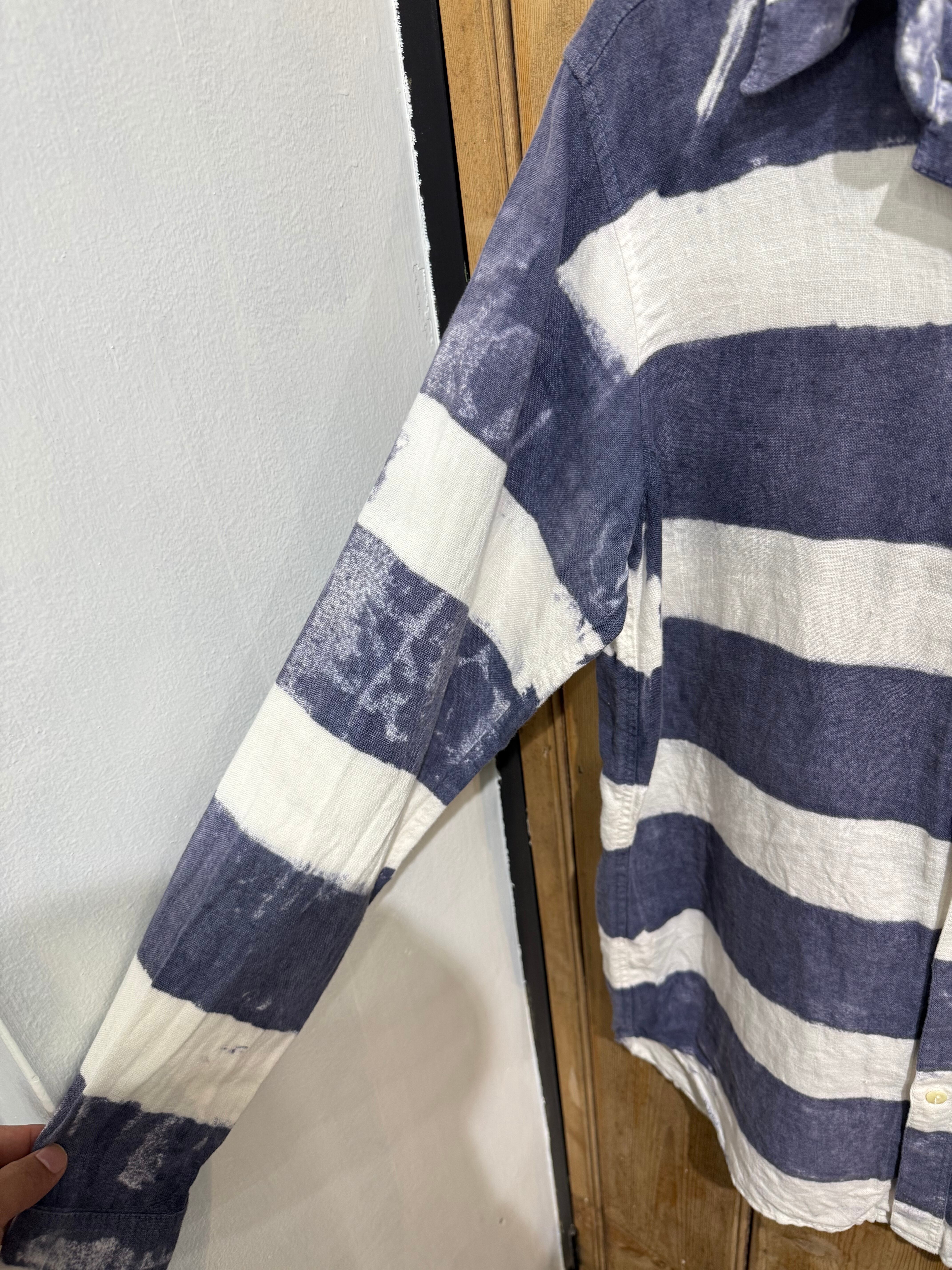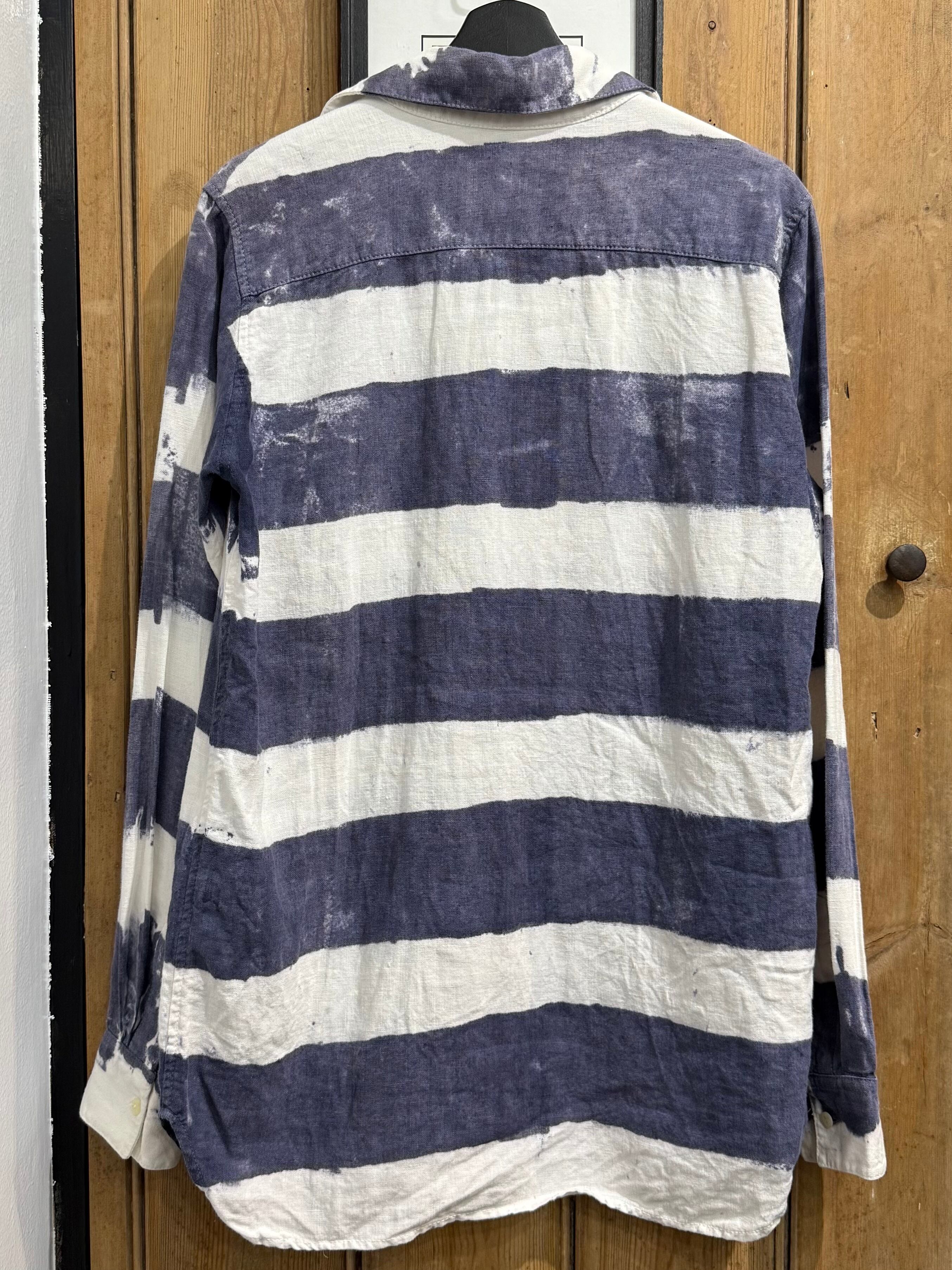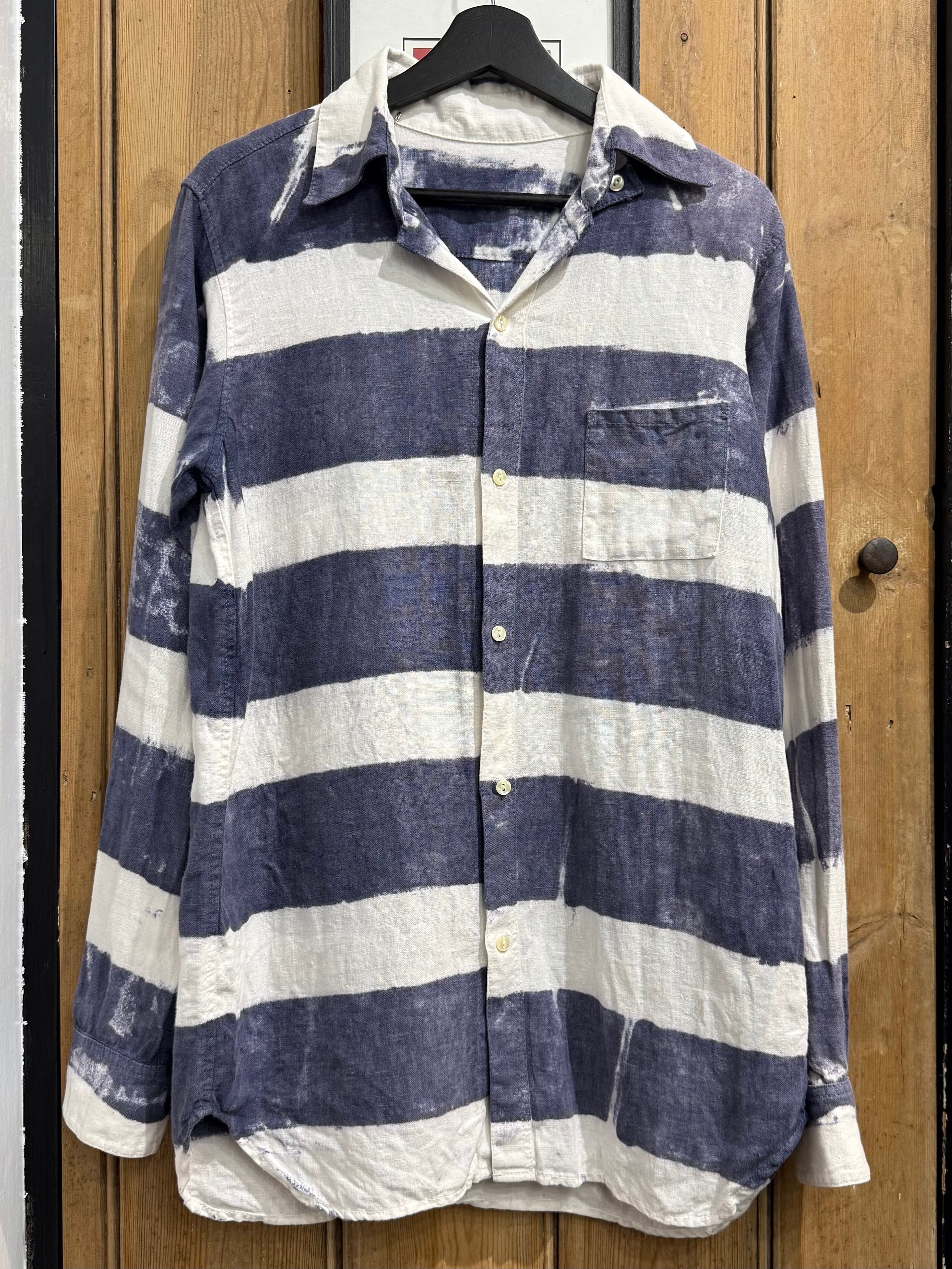 大胆な太ピッチのネイビー×ホワイトのボーダー柄が印象的なカジュアルシャツ。
