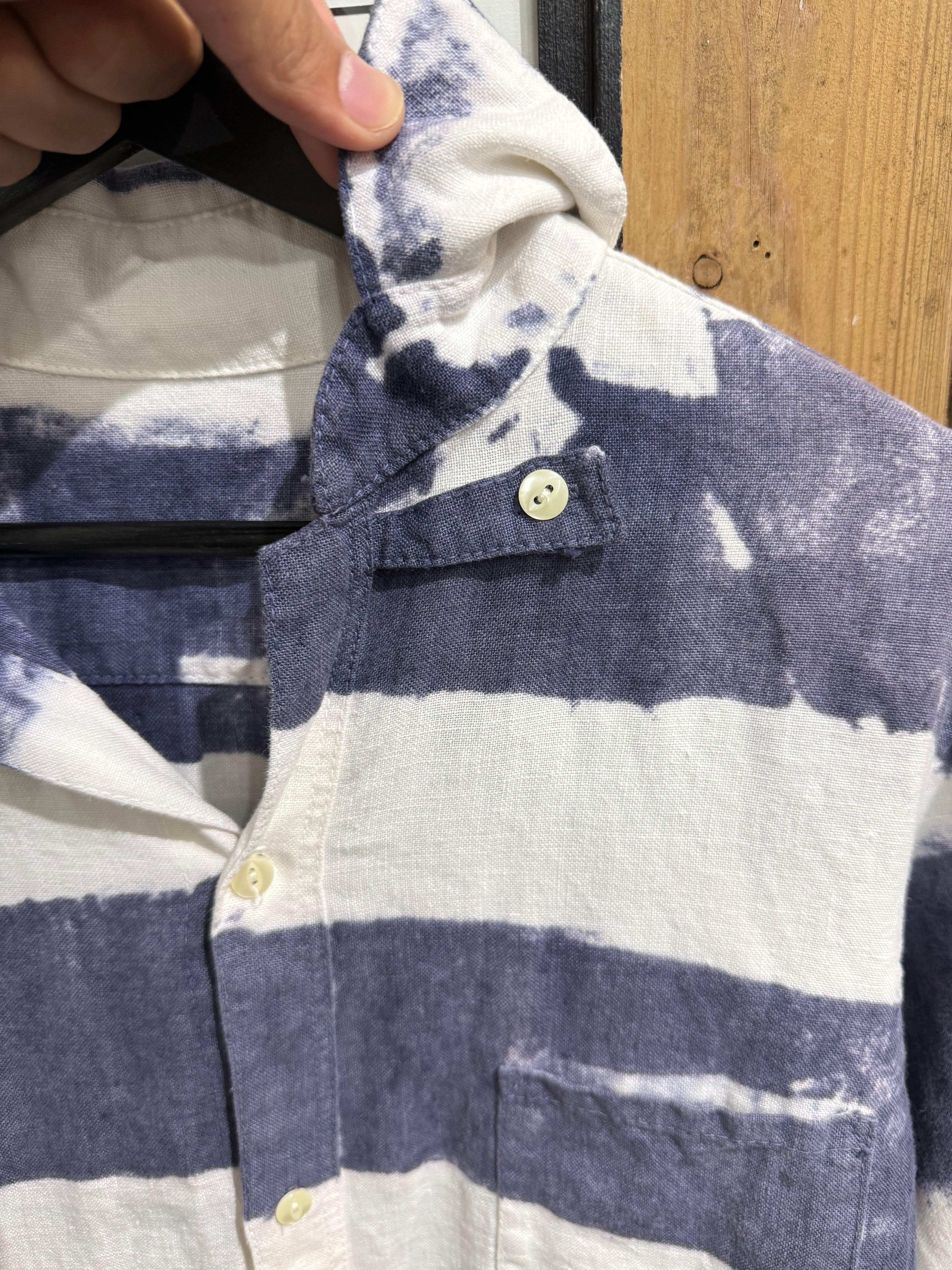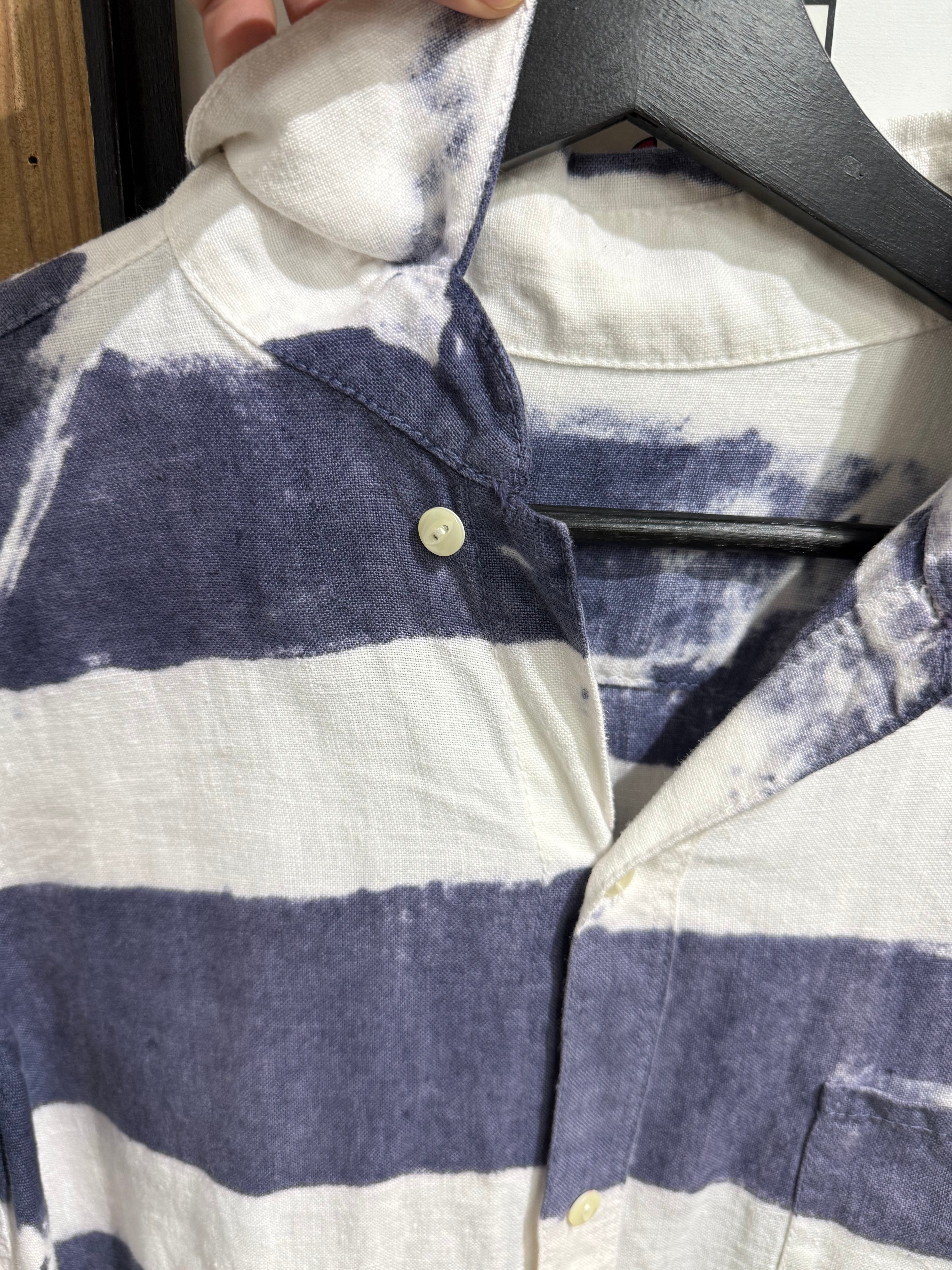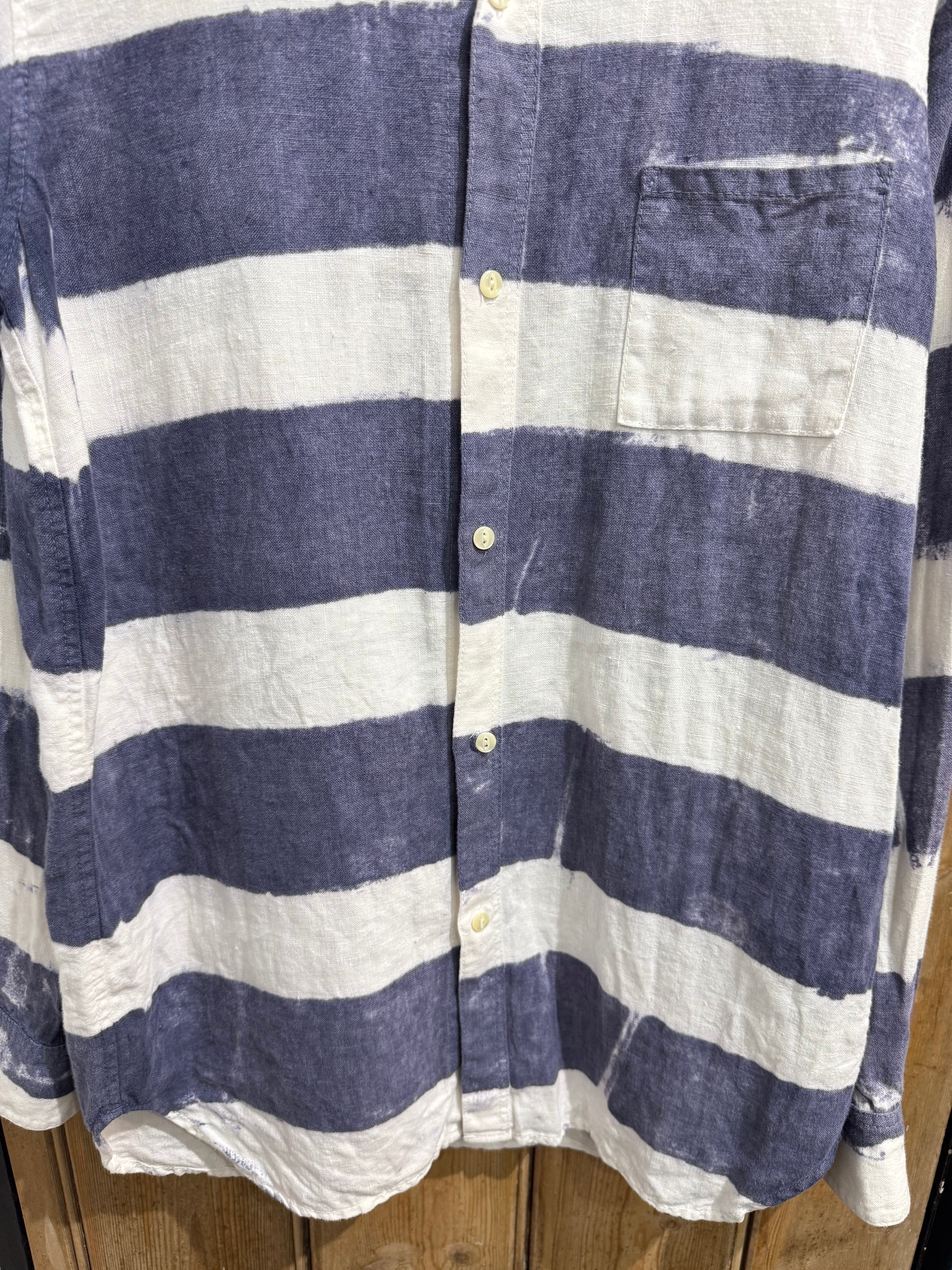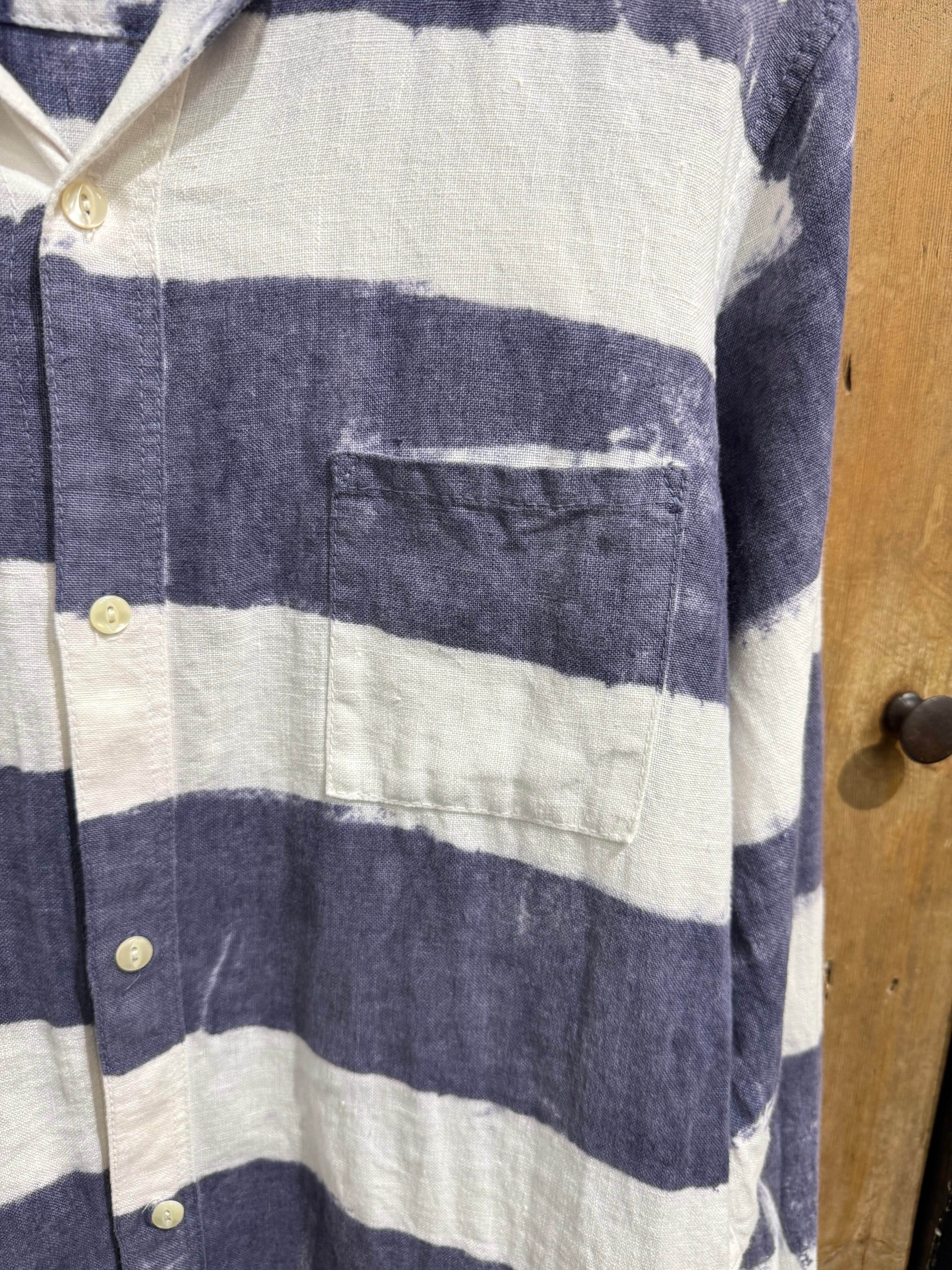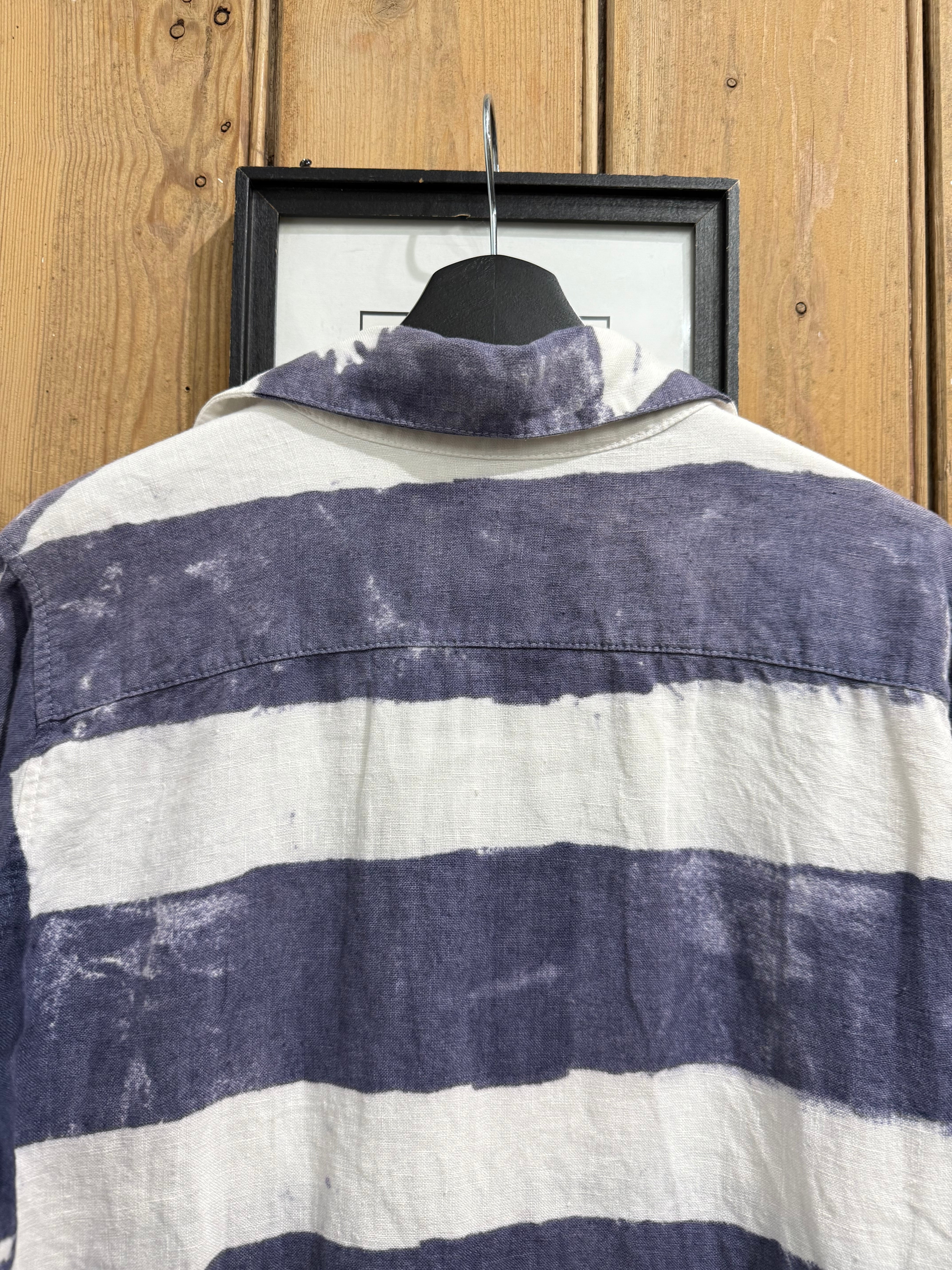 大胆な太ピッチのネイビー×ホワイトのボーダー柄が印象的なカジュアルシャツ。