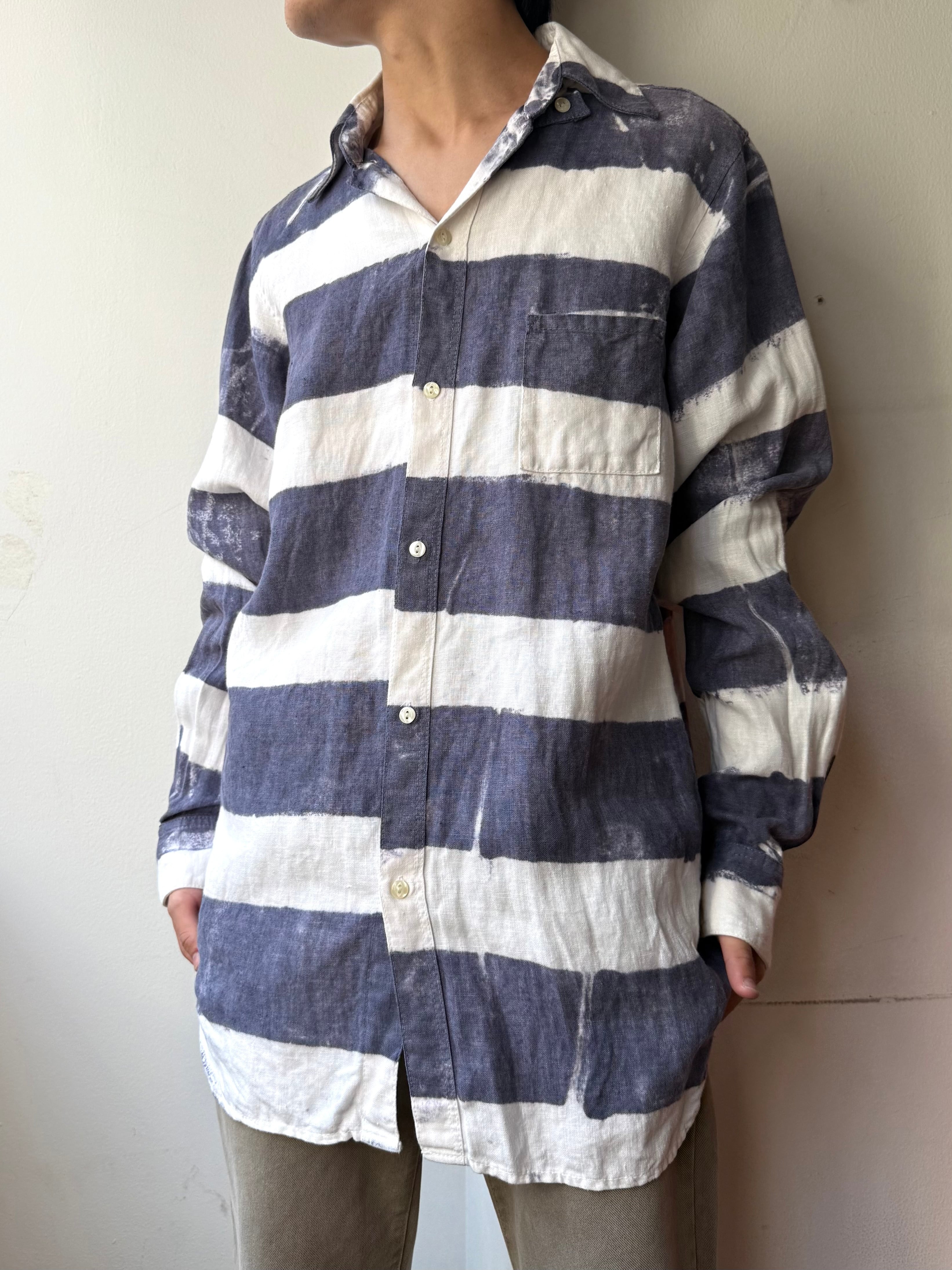 Open collar Loop collar Chin strap Border Shirt / オープンカラー ループカラー チンスト ボーダー柄 長袖 シャツ | TOMOSHIBI USED&VINTAGE CLOTHING