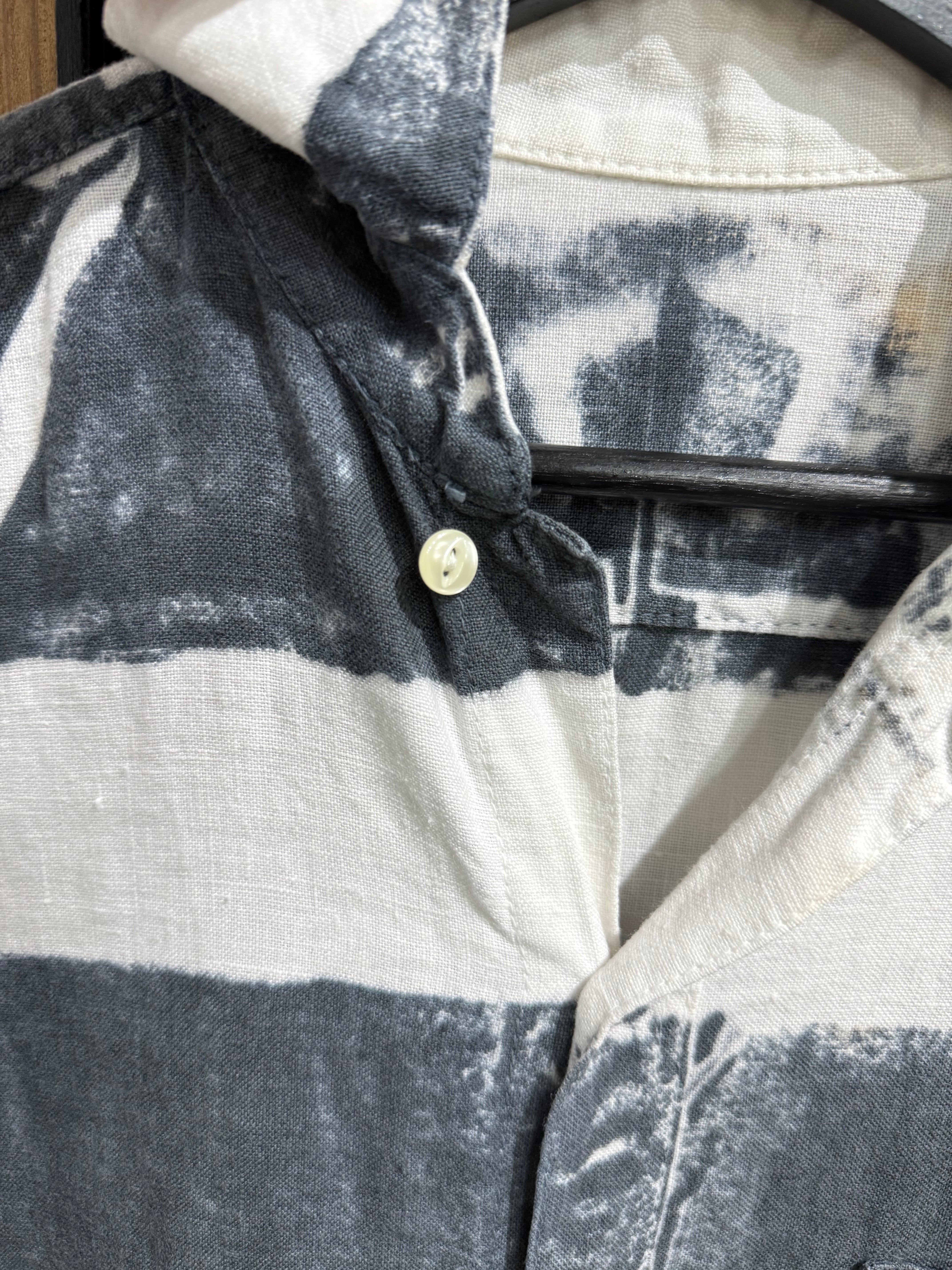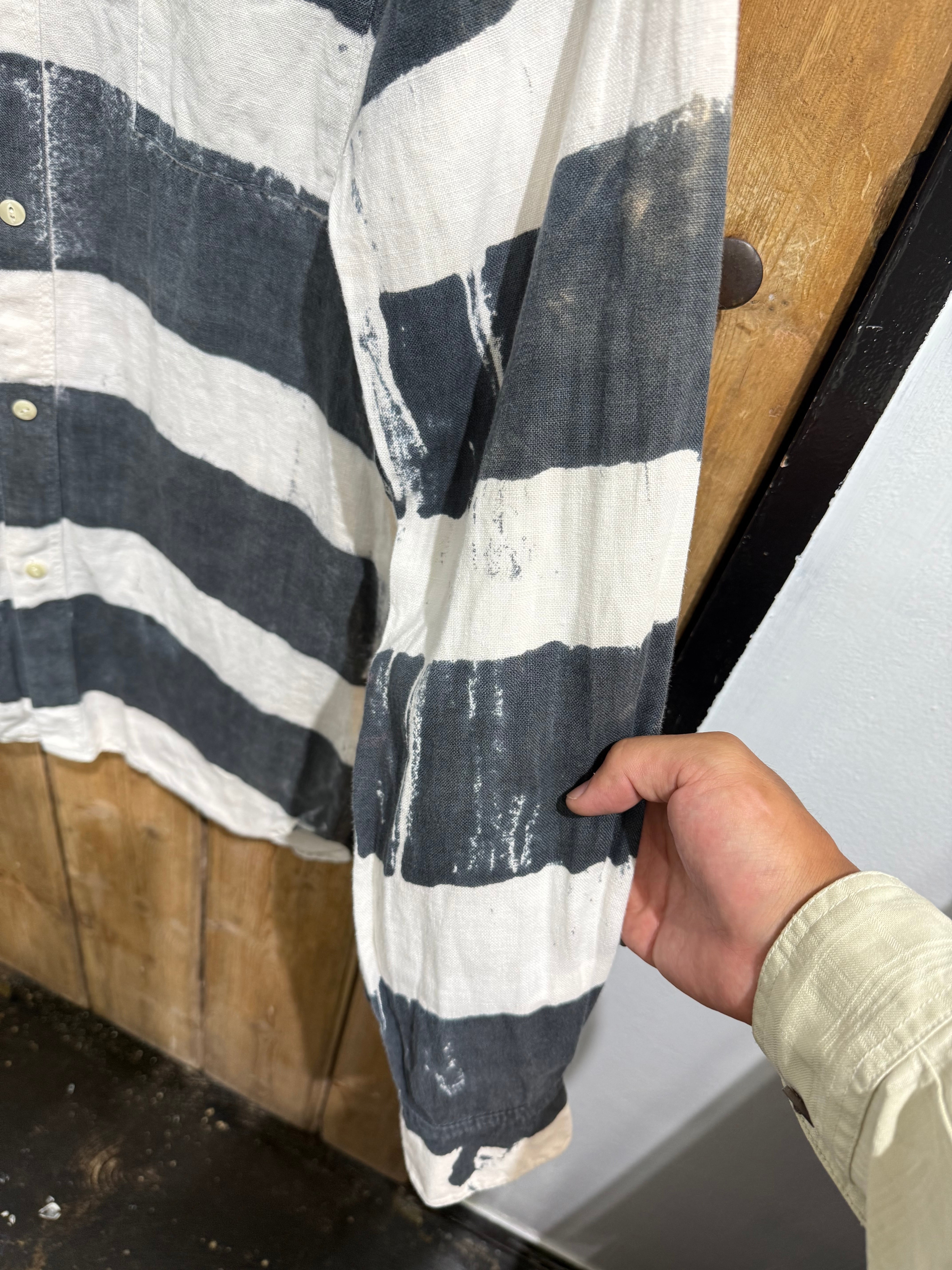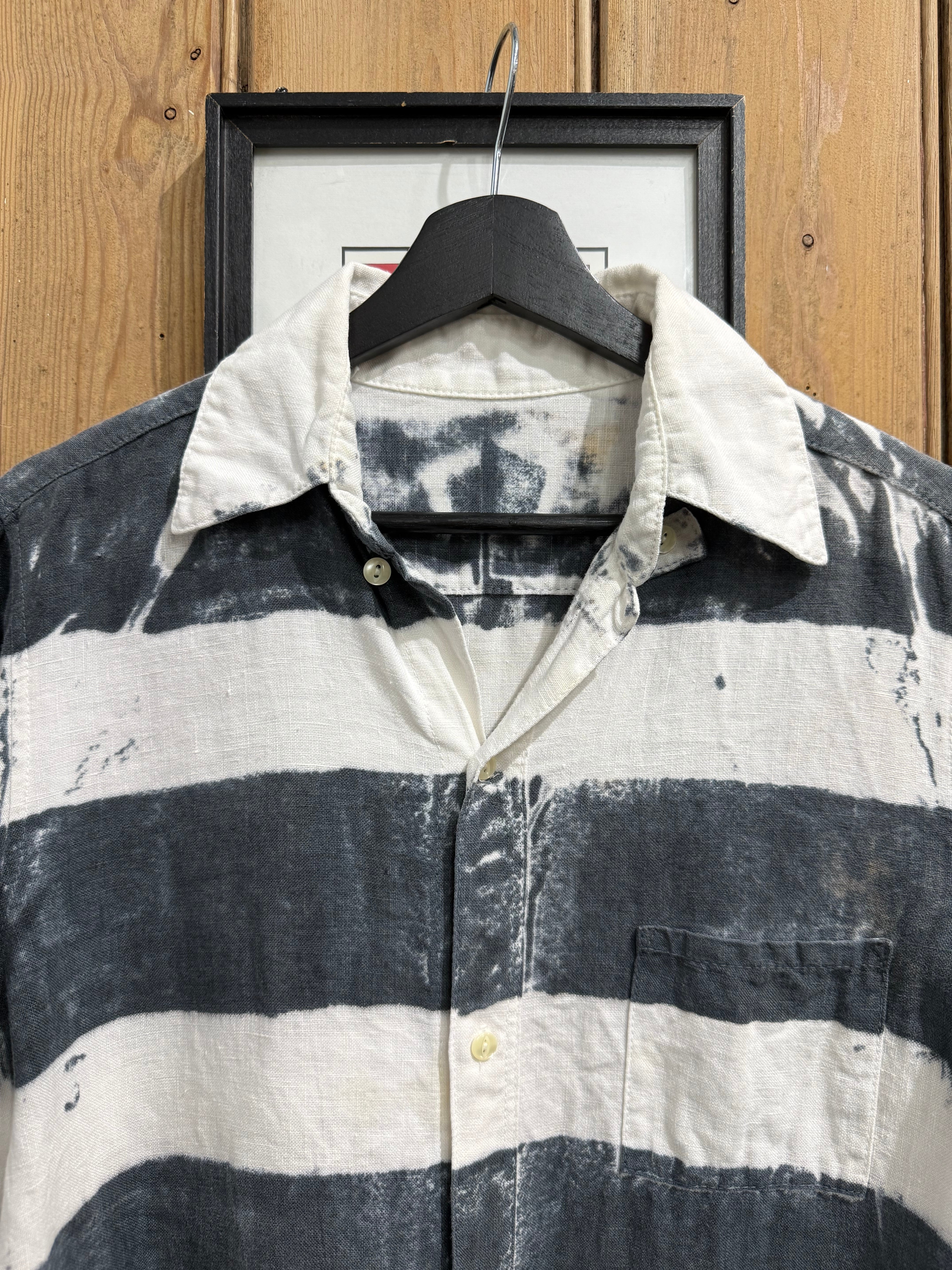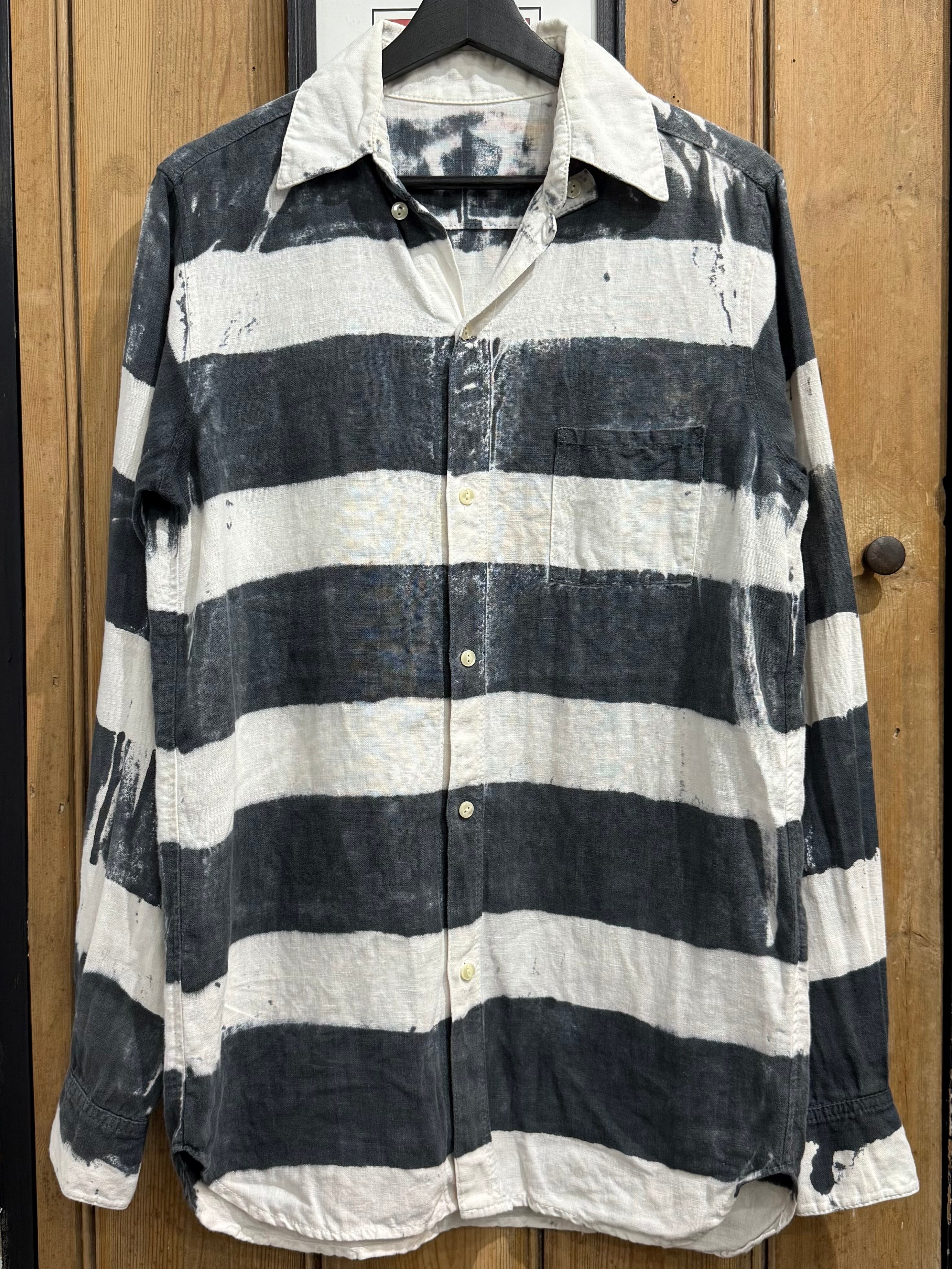 大胆な太ピッチのブラック×ホワイトのボーダー柄が印象的なカジュアルシャツ。