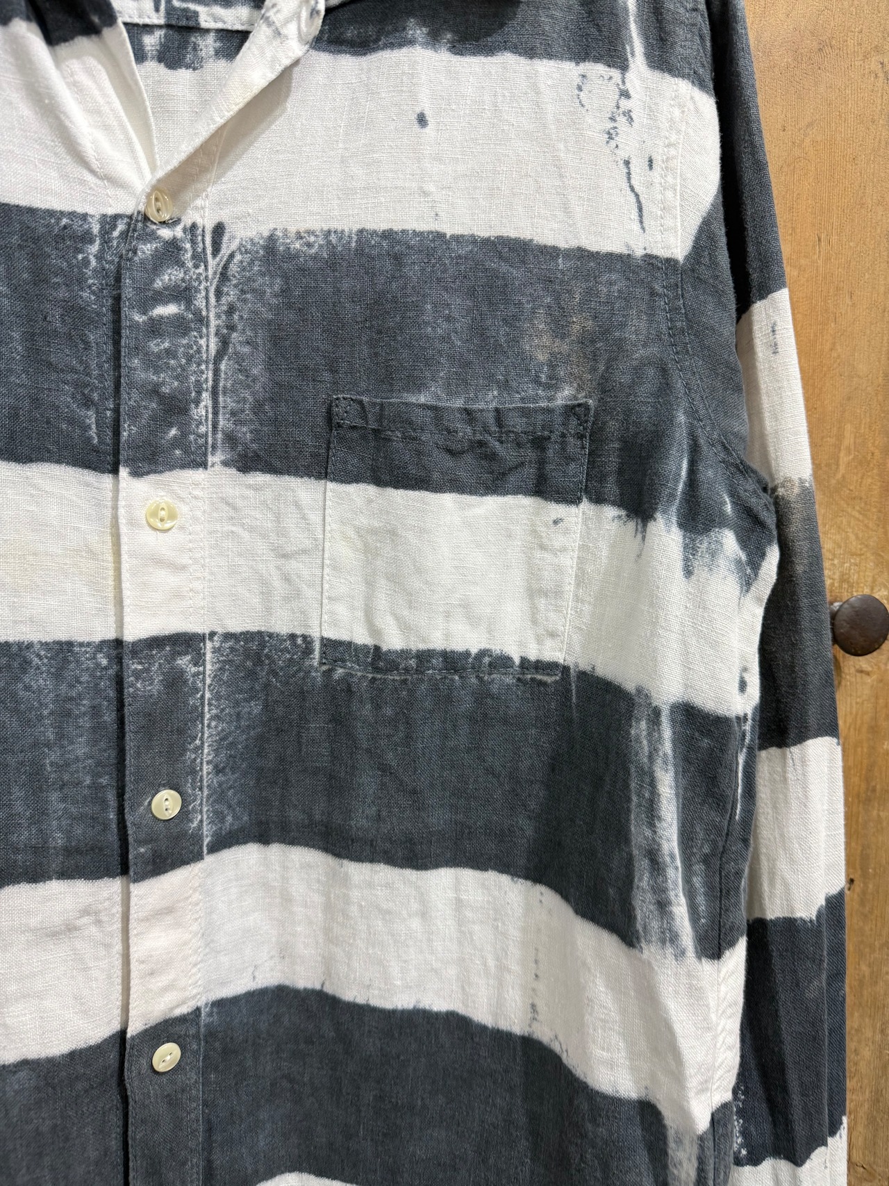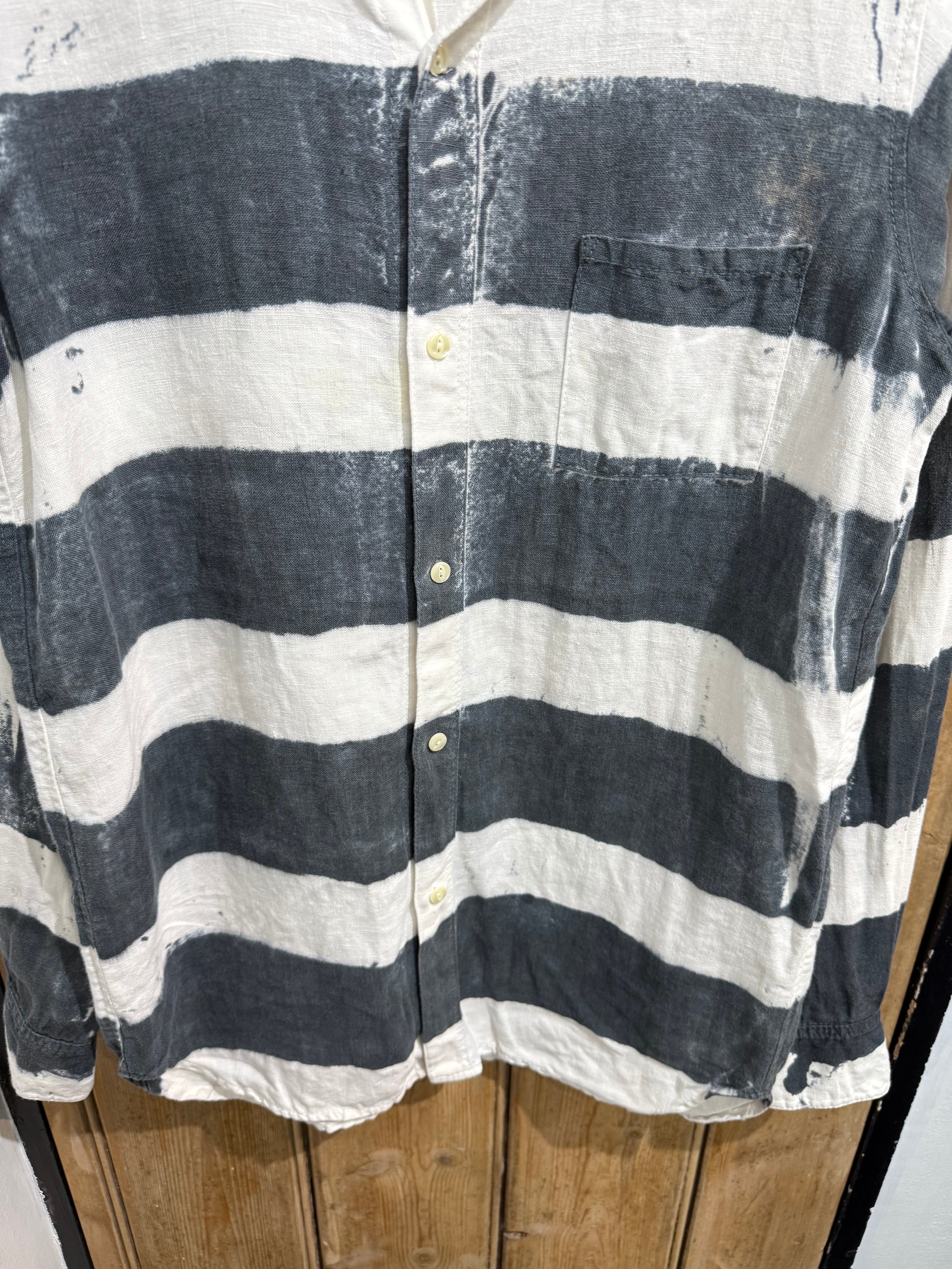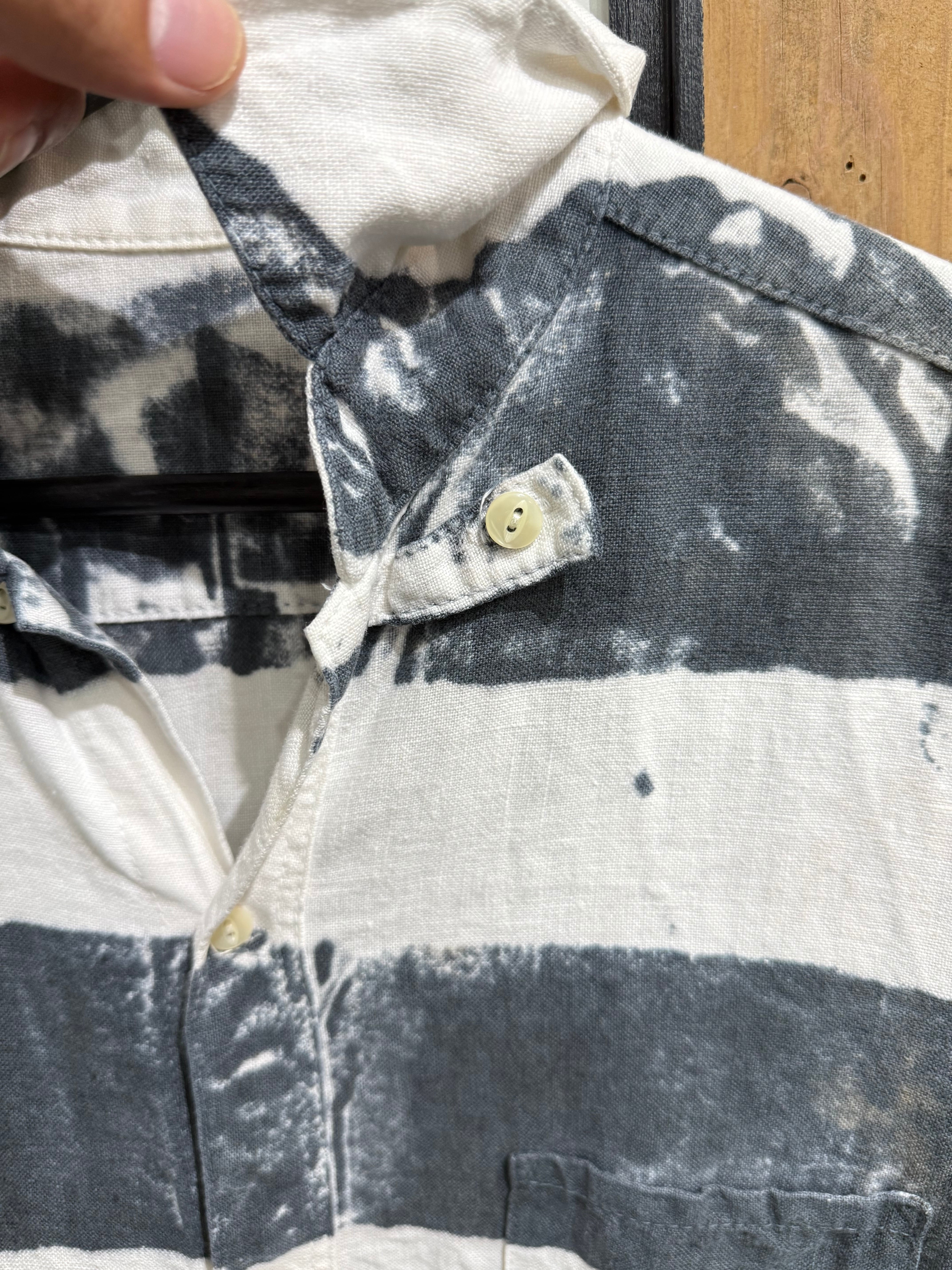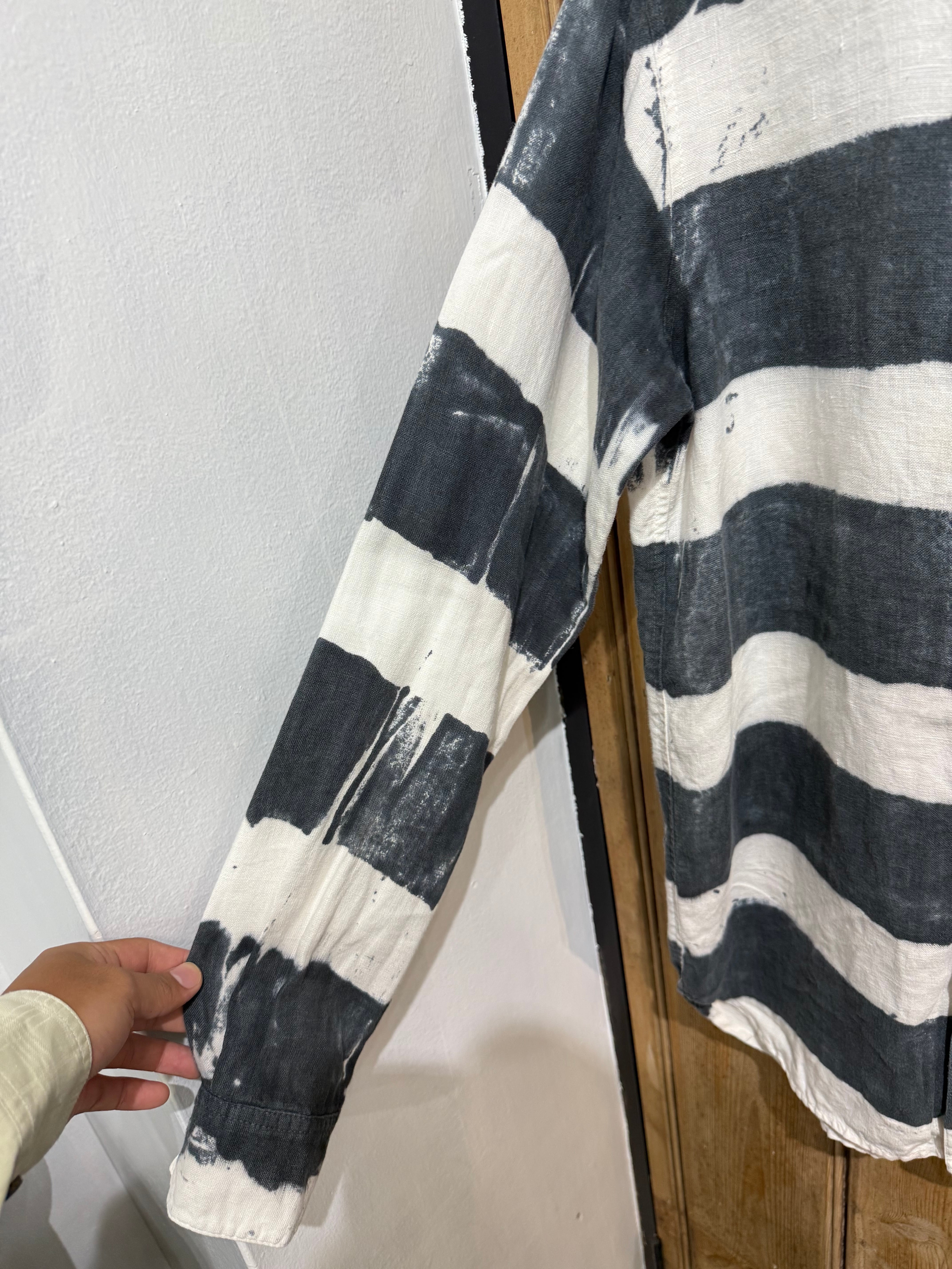 大胆な太ピッチのブラック×ホワイトのボーダー柄が印象的なカジュアルシャツ。