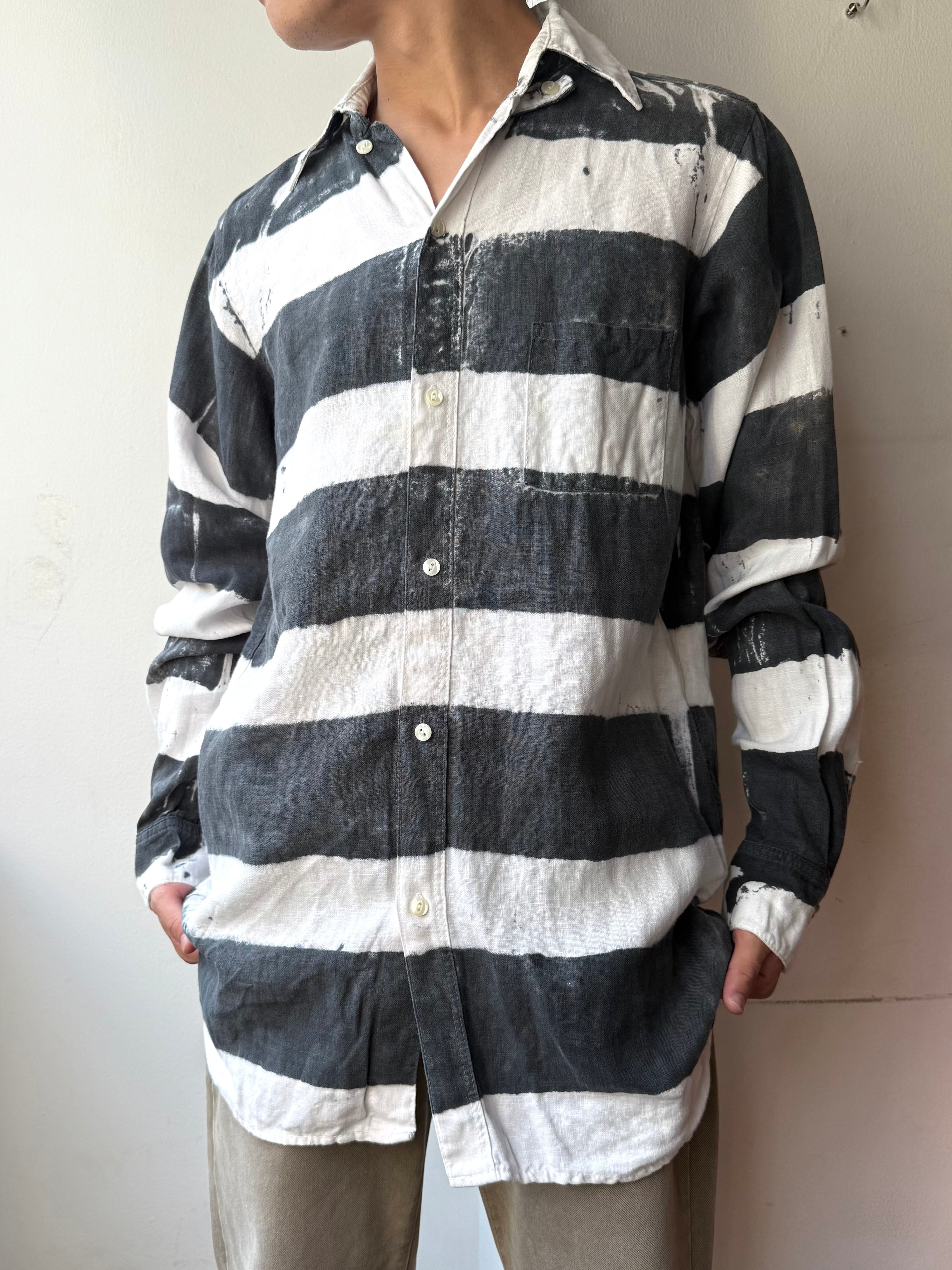 Open collar Loop collar Chin strap Border Shirt / オープンカラー ループカラー チンスト ボーダー柄 長袖 シャツ | TOMOSHIBI USED&VINTAGE CLOTHING