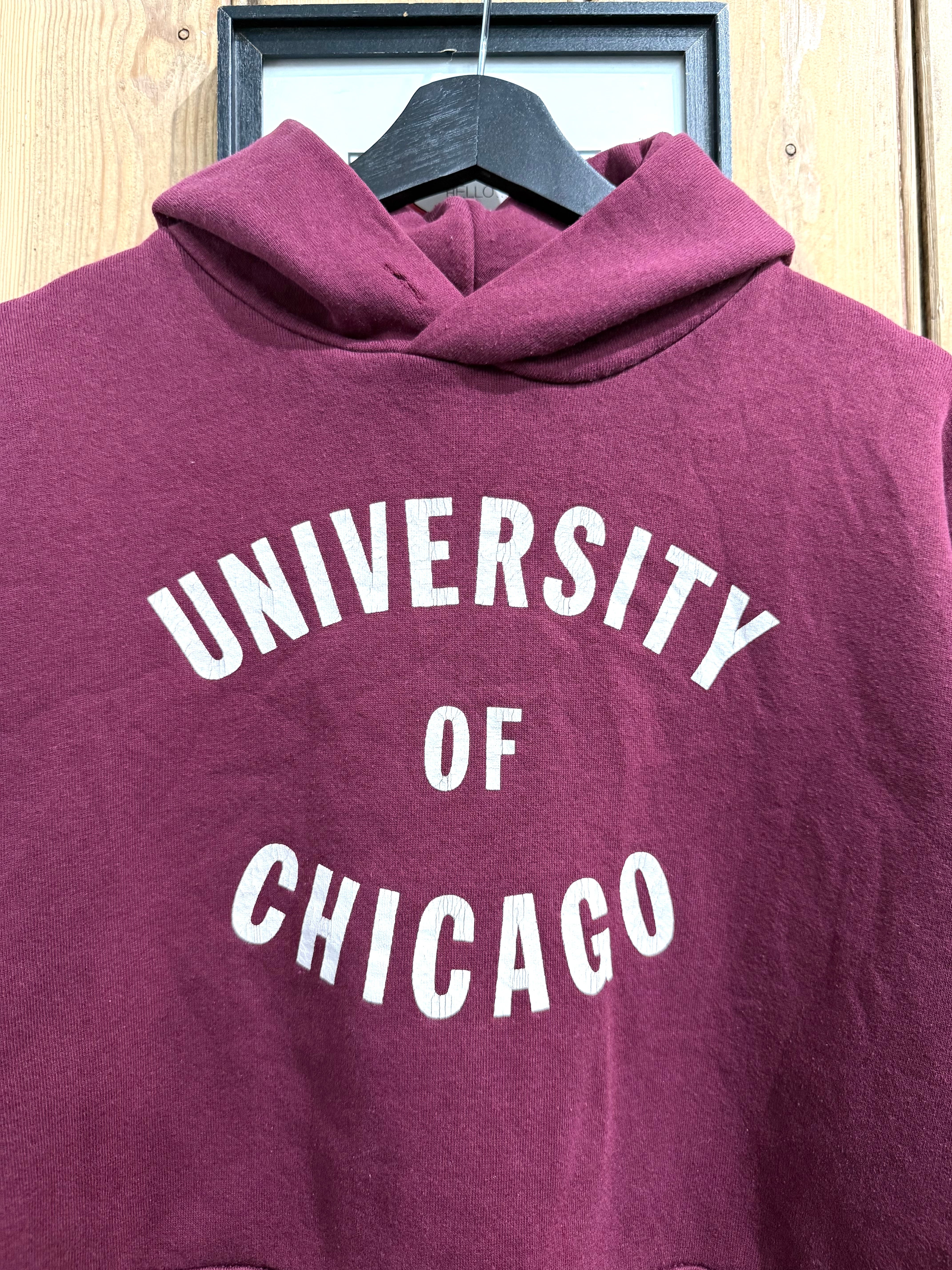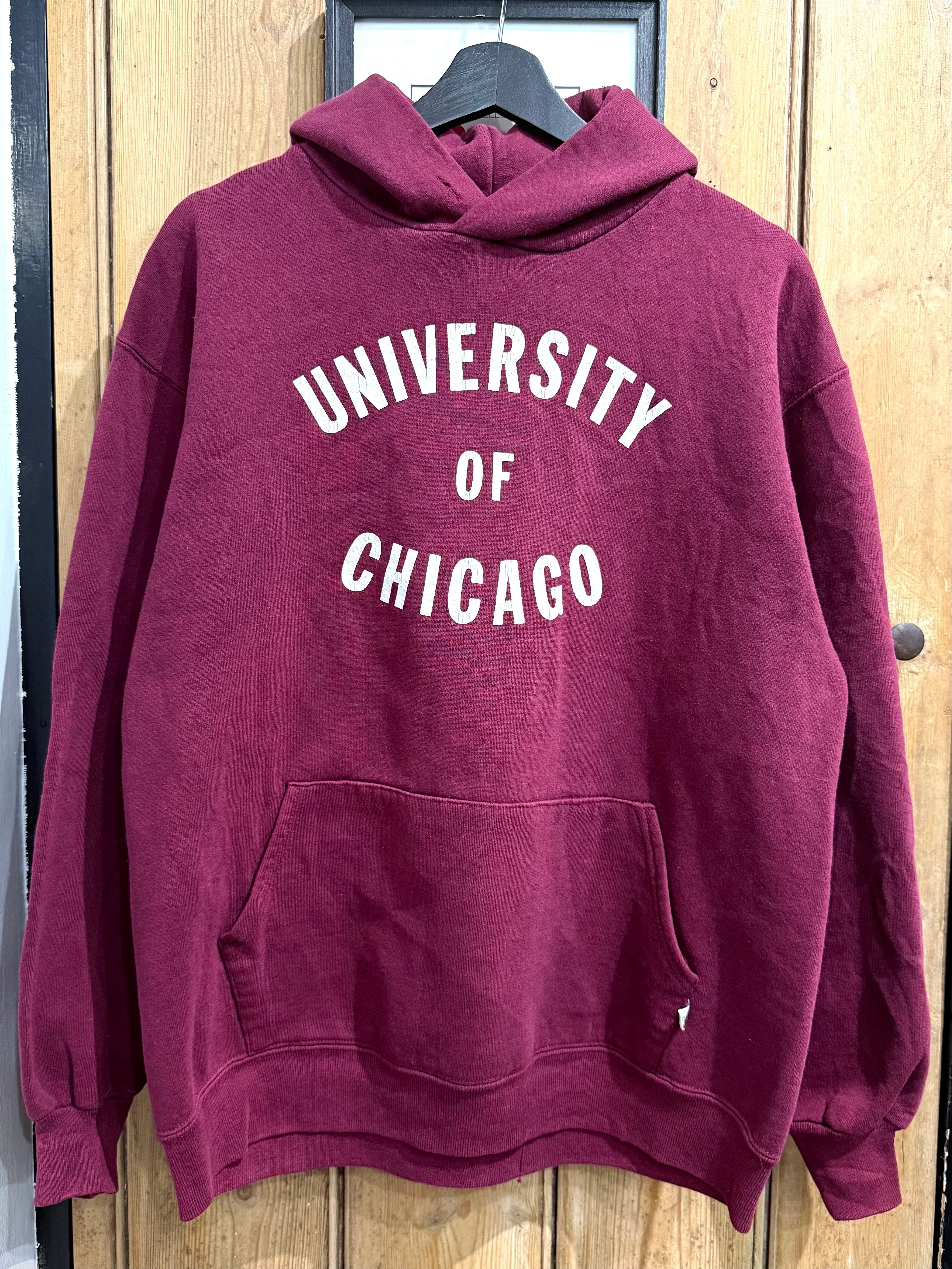 フロントには UNIVERSITY OF CHICAGO のカレッジロゴが入り、落ち着いたバーガンディの色合いが合わせやすい1着です。
