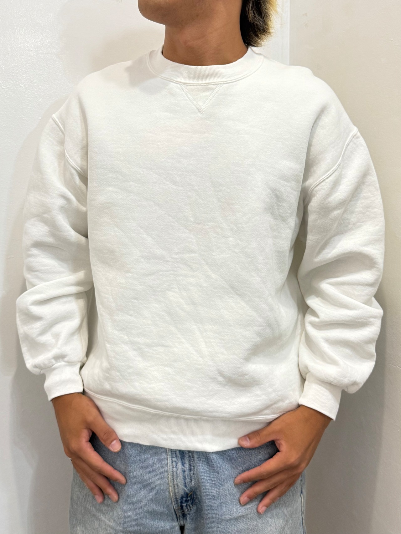シンプルな無地デザインで、フロントのVガゼットやリブ仕様などクラシックなディテールが光る1枚です。