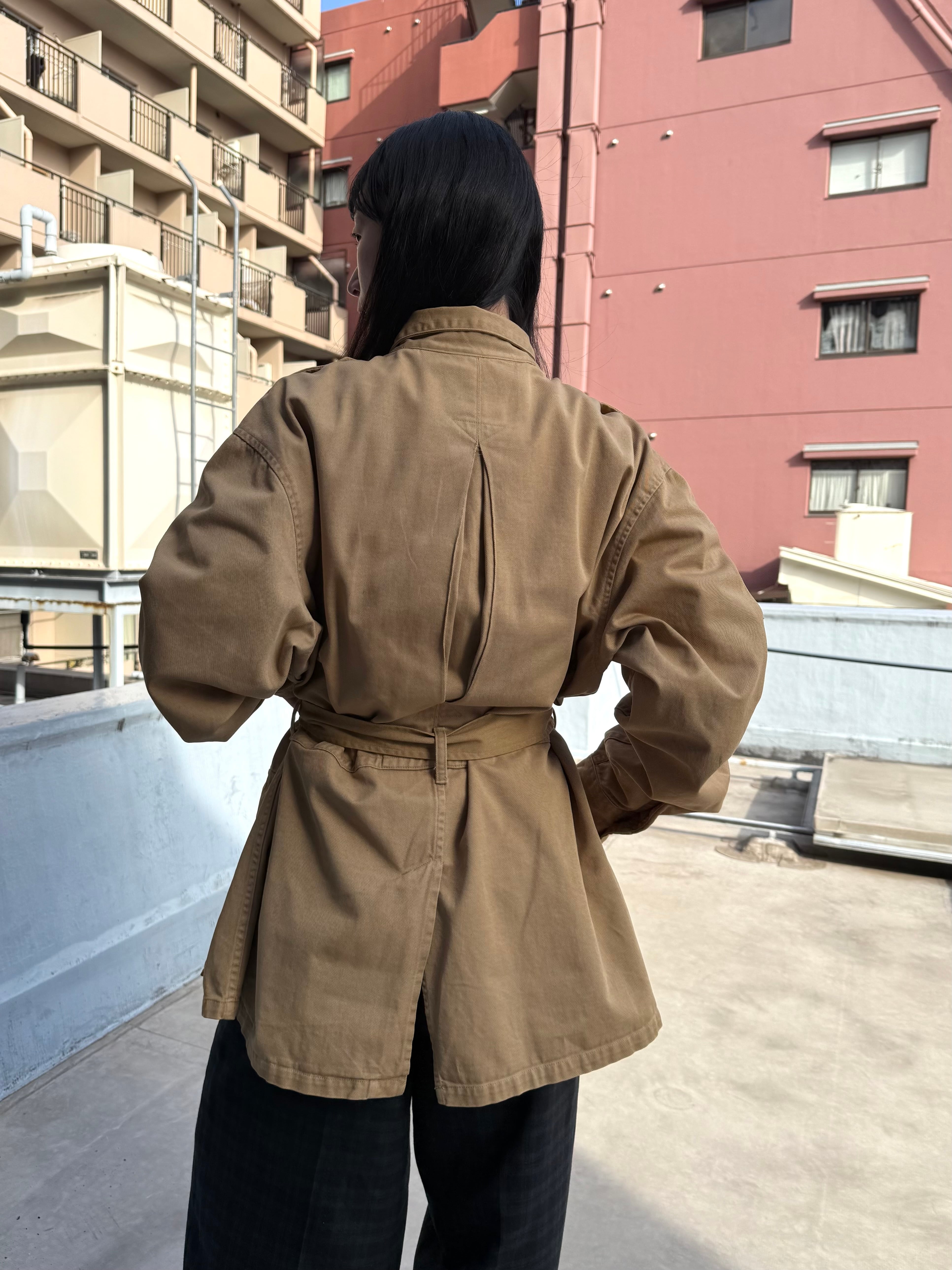 ベルトでぎゅっと絞っても、崩れないとても綺麗なシルエットです。ベルトはせず、コートとして着用も可能。
