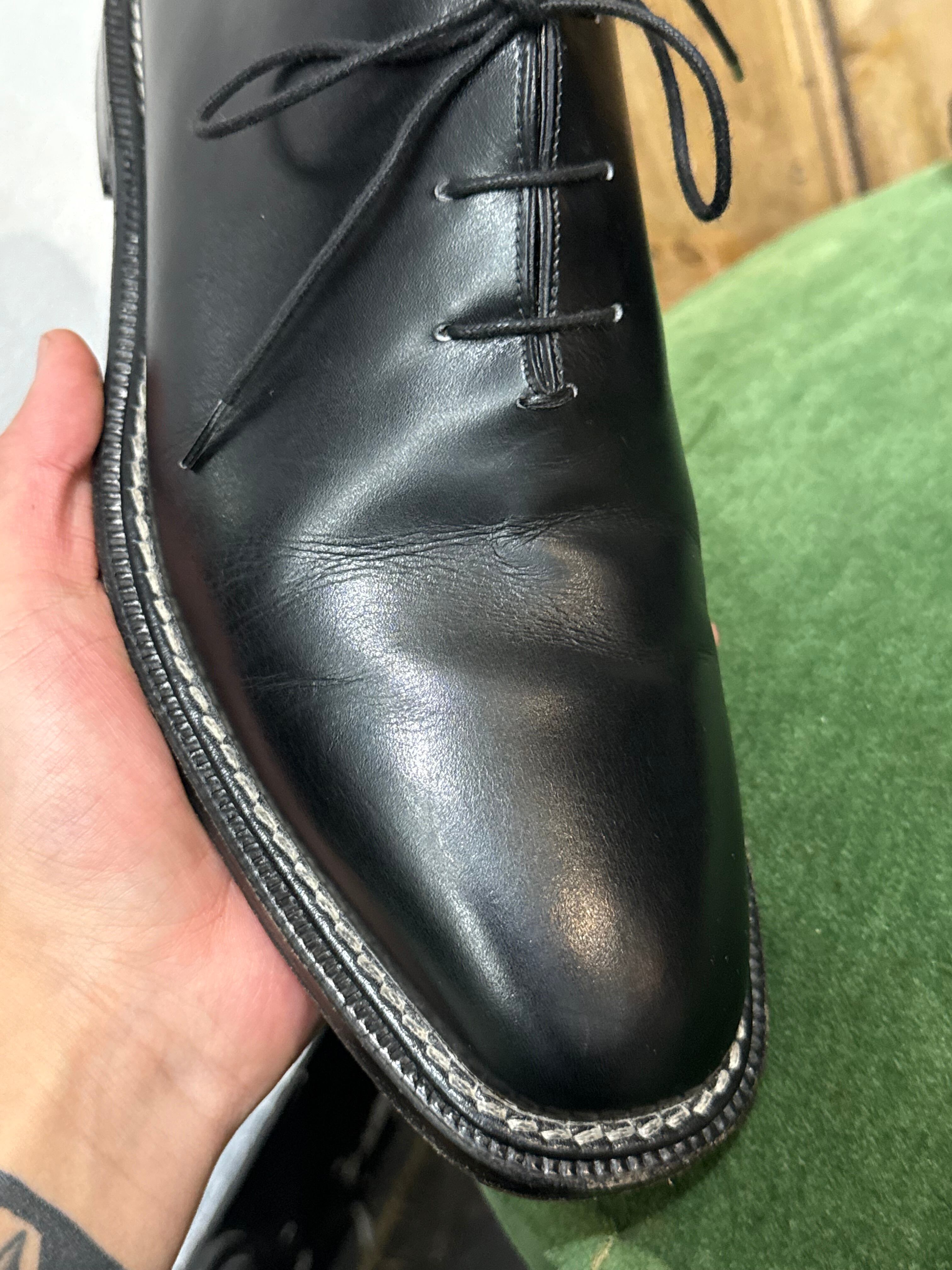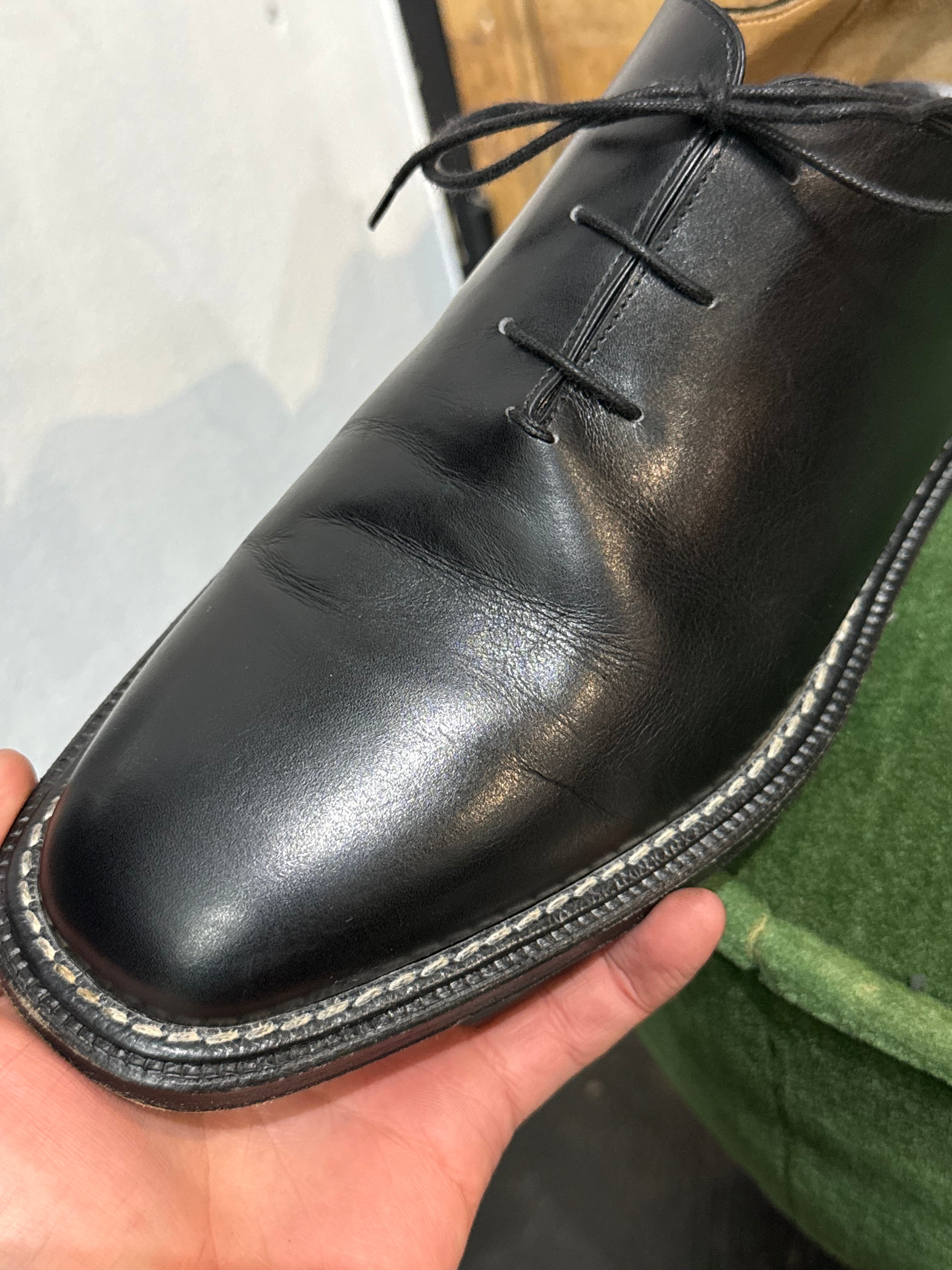 通常のマッケイ製法には見られない仕様として、コバに出し縫いが見られ、オールソールがグッドイヤーウェルテッド製法同様に可能となります。